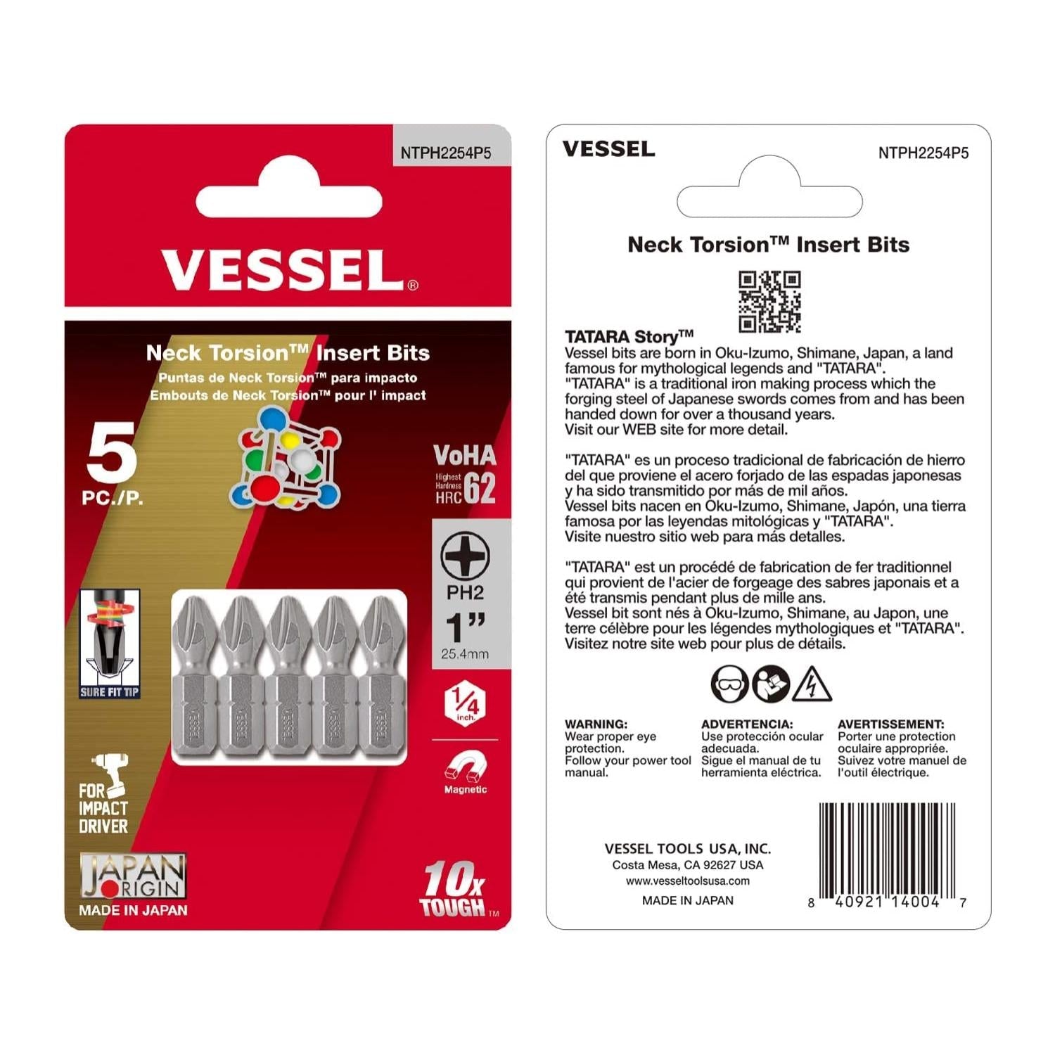 Vessel Tools NTPH2254P5 Neck Torsion Power Bits, PH2 x 25.4 mm, 5 Pc.