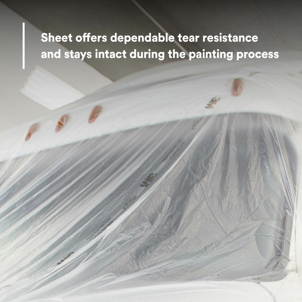 3M Overspray Protective Sheeting is a paintable, high density and tear-resistant translucent film for critical edge masking as well as for paint overspray. We make our overspray protective sheeting in a variety of sizes to protect various types of vehicles, including cars, vans, SUVs and trucks.3M™ Overspray Protective Sheeting shields cars. trucks or vans from overspray while being repainted. Our specially formulated high density polyethylene film (HDPE) offers excellent paint adhesion and paint overspray adhesion. It resists paint flaking, which eliminates the need for masking paper at the critical paint edge. The sheeting clings to vehicle and has center printing for easy alignment, which makes it easy to handle. Sheeting easily cuts to any size needed for a project. Using overspray protective sheeting eliminates the need for masking paper to skirt the lower part of the vehicle.