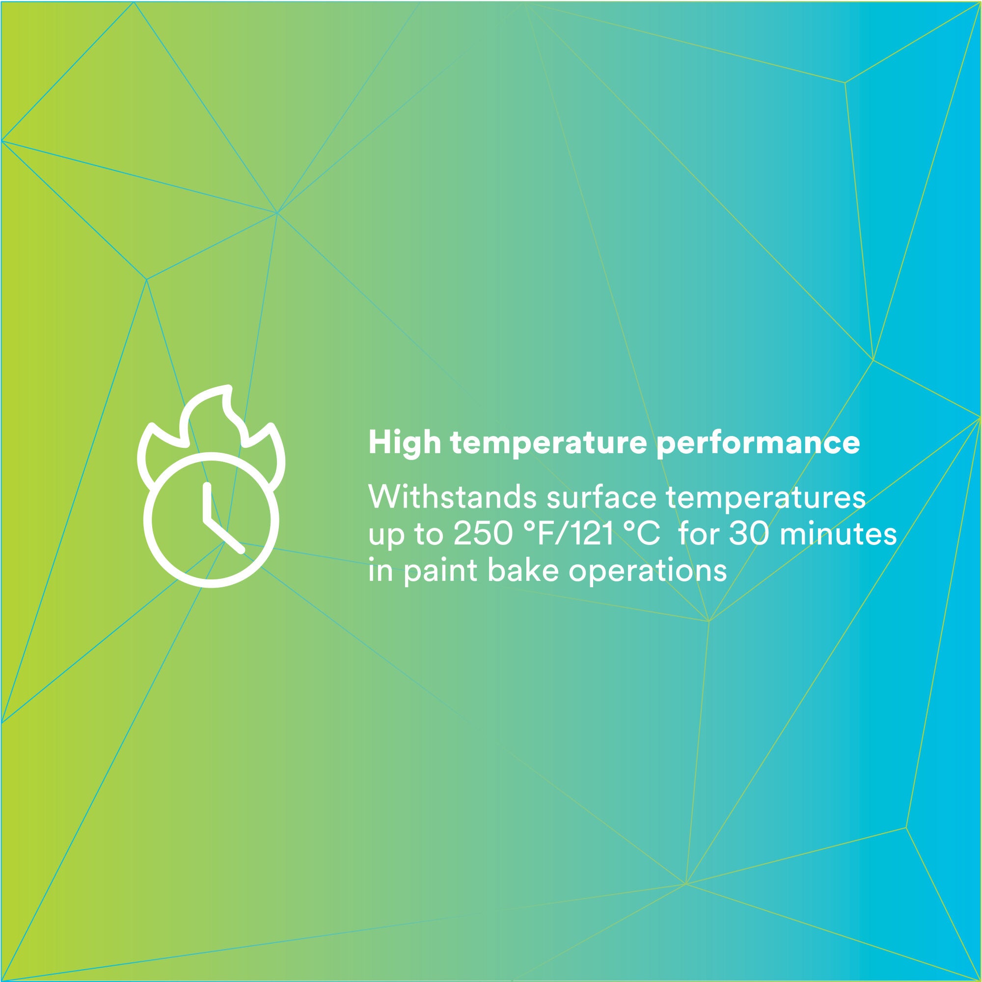 - Withstands surface temperatures up to 250°F/121°C for 30 minutes in paint bake operations