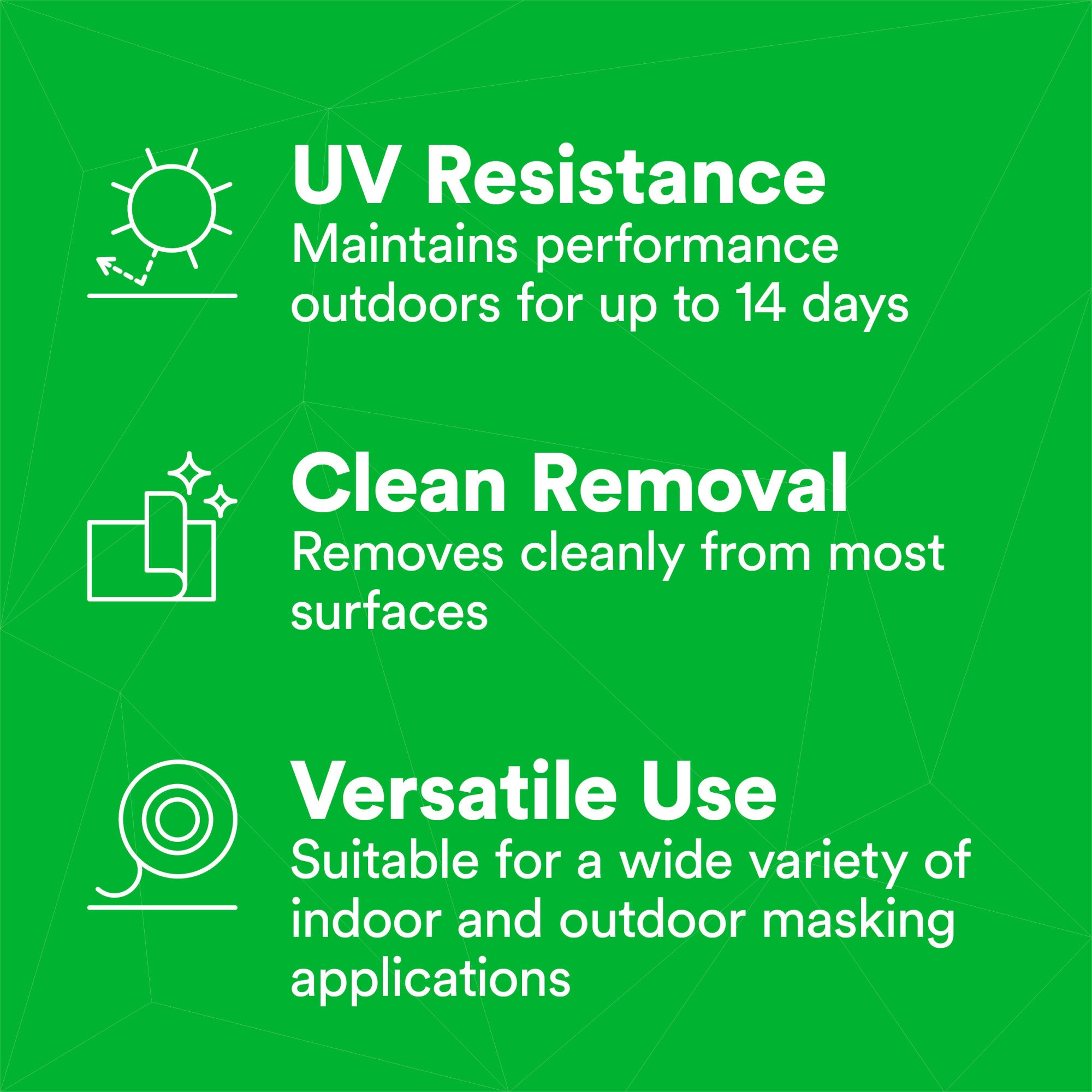 Indoors and outdoors, the tape removes cleanly from most surfaces with little to no edge residue for up to 14 days. It features controlled unwind to prevent slivering and tears easily from the roll by hand. Intended for applications where UV exposure is expected, including bundling, holding, sealing, paint masking and surface protection.