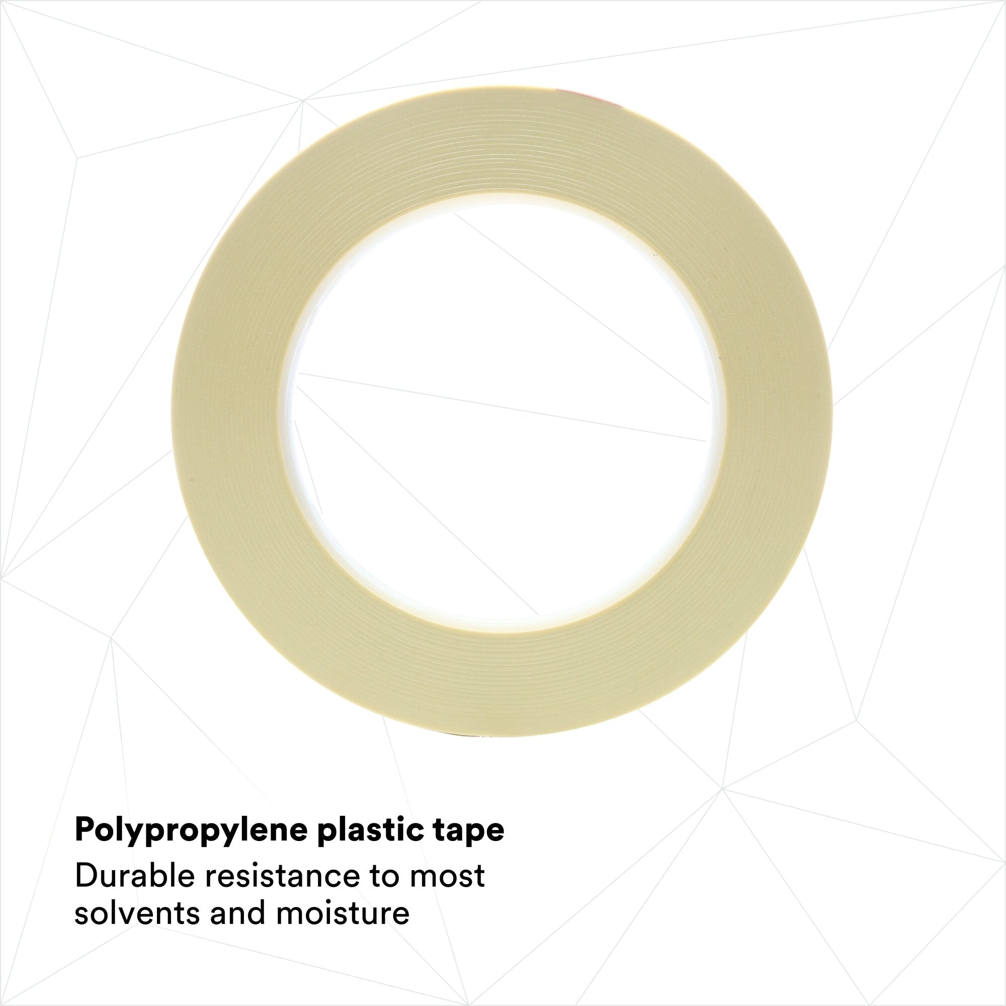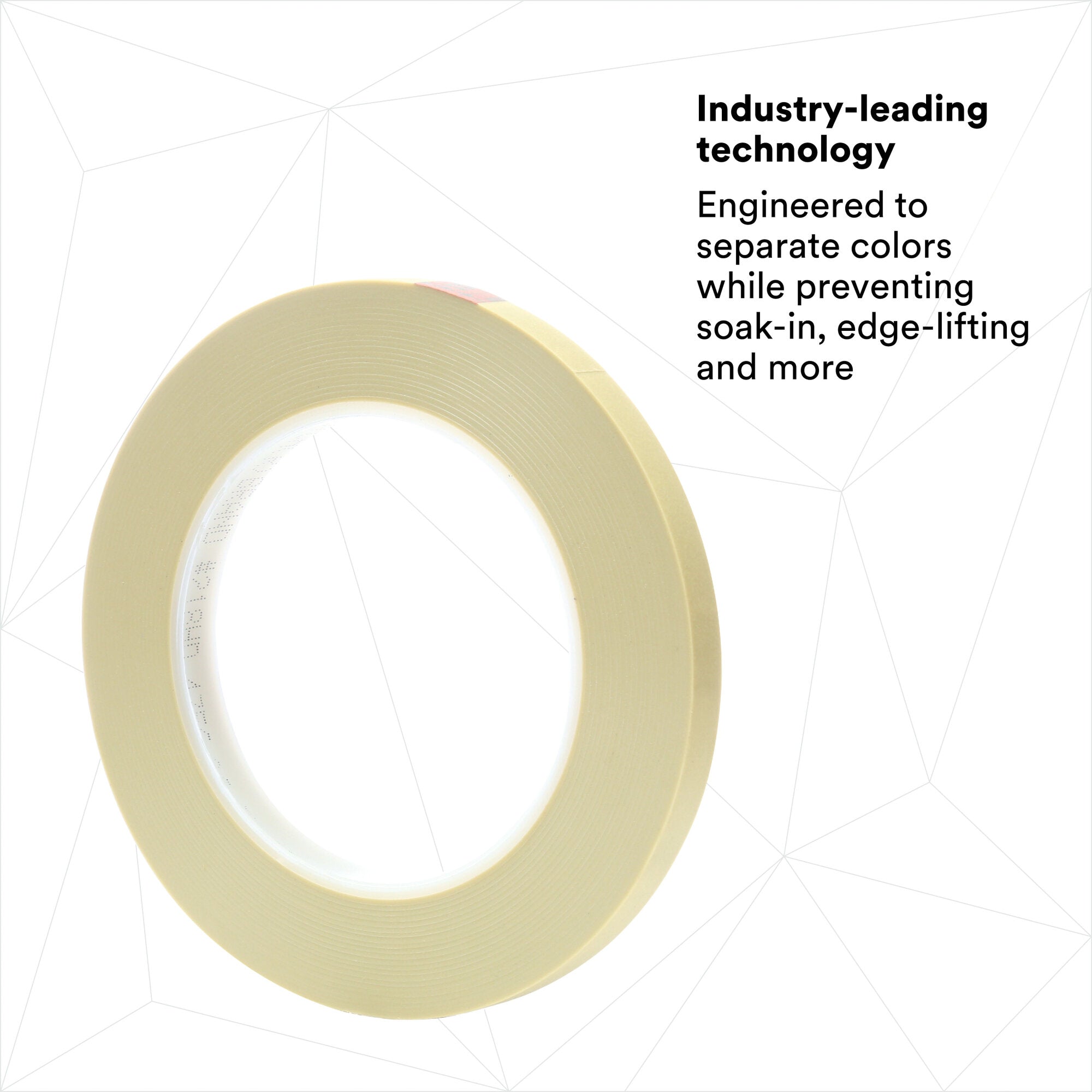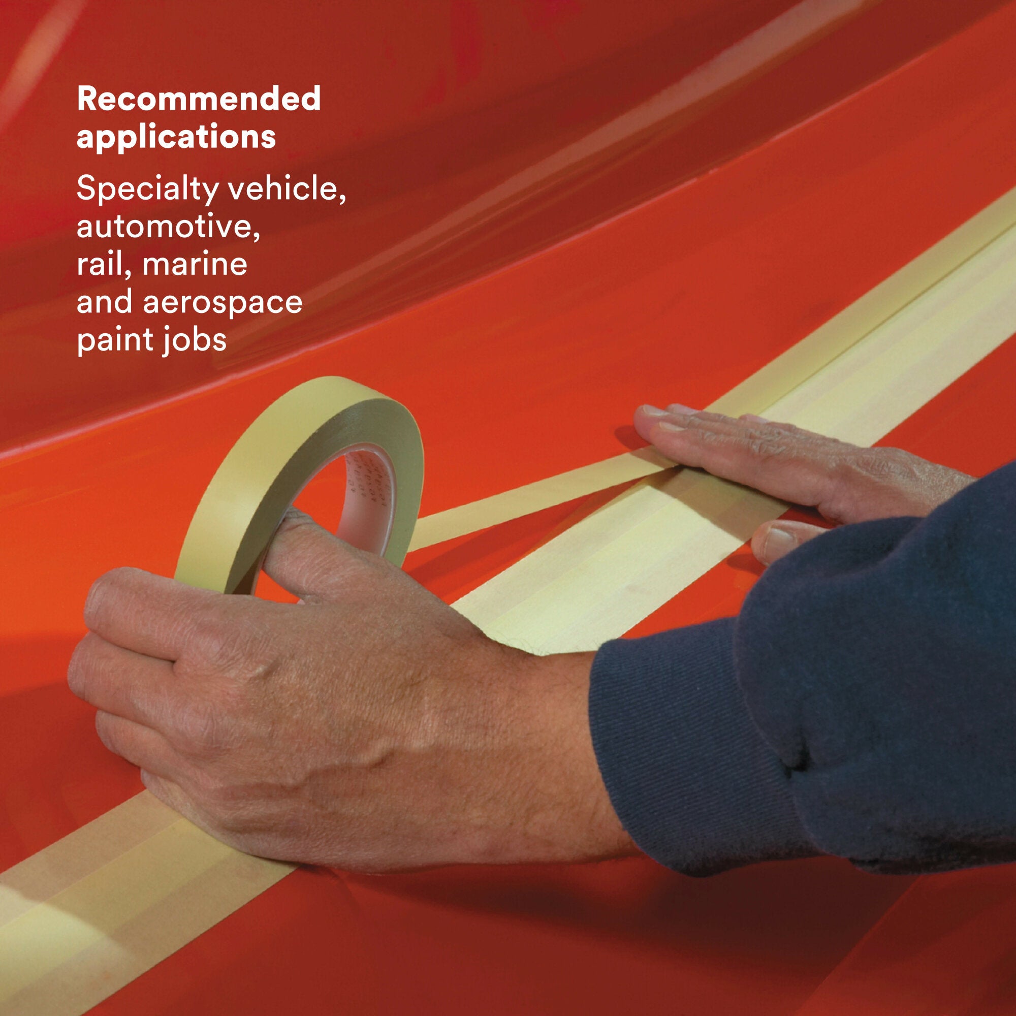 Scotch Fine Line Tape 218 is a high-performance polypropylene plastic tape that has both a low profile and high adhesion for use in painting long straight lines and sweeping curves where a crisp, sharp paint line is desired. It is often used as a layout tape for high value multi-color and custom painted graphics.Perfect Your Straight Lines and Sweeping Curves Scotch® Fine Line Tape 218 features a natural rubber pressure adhesive capable of delivering the high instant adhesion necessary for critical, large-scale paint applications. This tape has proven itself to be ideal for painting long, straight lines as well as smooth, sweeping curves. The polypropylene backing is stiffer than vinyl fine line tapes, while conforming easily around corners. Scotch® Fine Line Tape 218 features good moisture and solvent resistance. It resists heat in bake cycles that reach 250ºF/121ºC for up to 30 minutes. Recommended Applications Fine line paint masking Paint masking for specialty vehicle, automotive, rail, marine and aerospace paint jobs Paint masking for custom, two-tone and multiple color applications Layout tape for high value, multi-color and custom painted graphics Accomplish Sharp Color Separation with 3M Fine Line Tapes As a recognized pioneer and leading designer in industrial tapes, adhesives and more, 3M has developed a comprehensive lineup of fine line tapes suitable for even the most critical of paint masking applications. These tapes feature industry-leading technology in their capability to separate colors while preventing soak-in, edge-lifting and more.