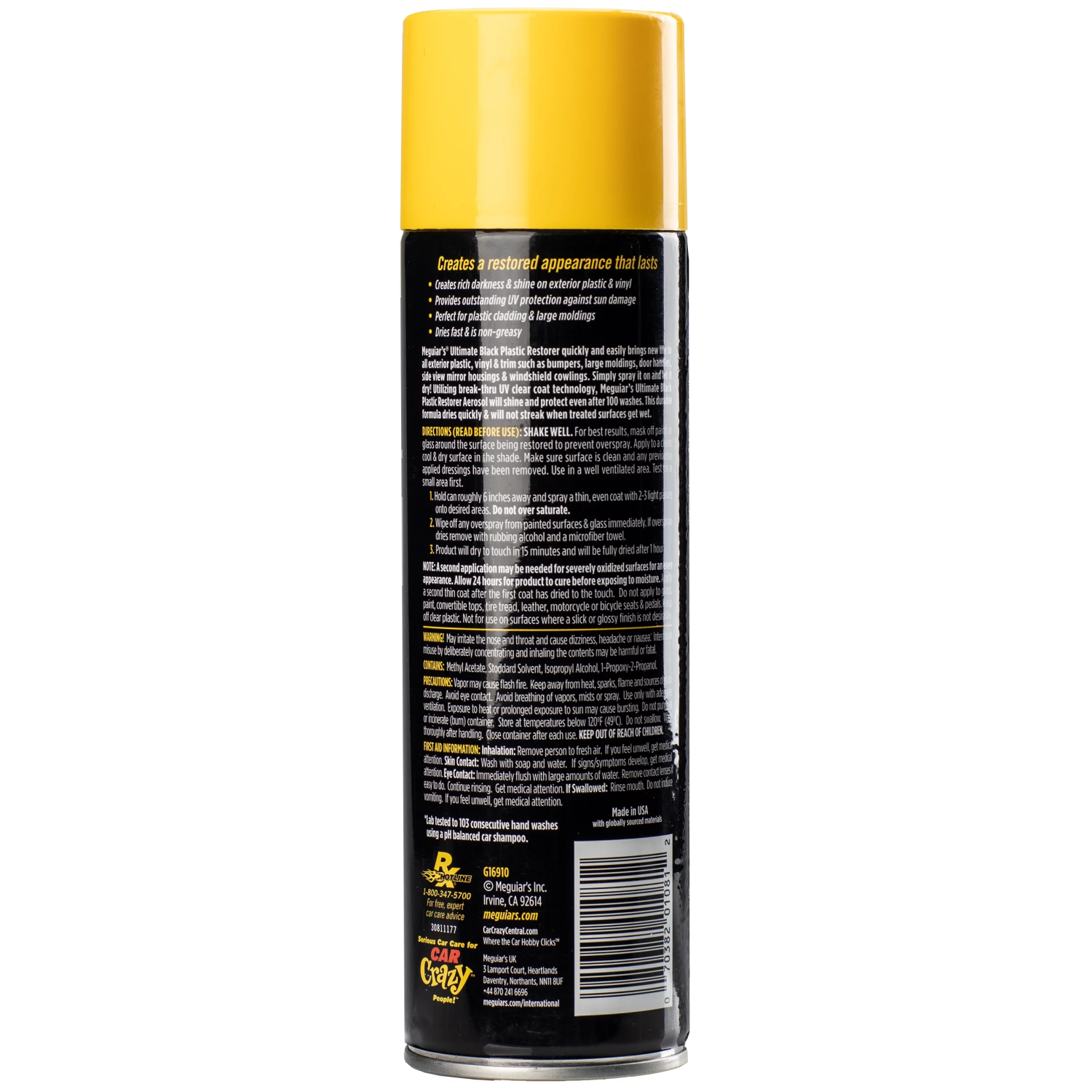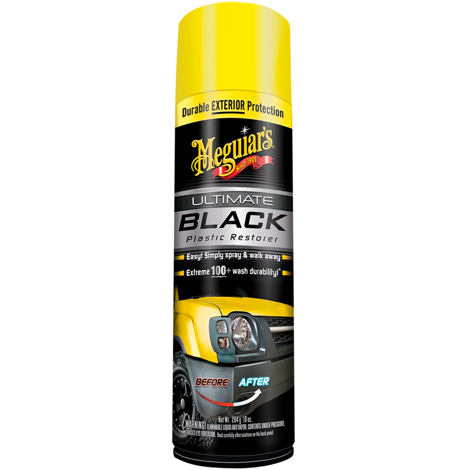 Meguiar’s® Ultimate Black Plastic Restorer quickly and easily brings new life to all exterior plastic, vinyl & trim such as bumpers, large moldings, door handles and rear view mirror housings. Simply spray it on and let it dry! Utilizing break-thru UV clear coat technology, Meguiar’s Ultimate Black Plastic Restorer Aerosol will shine and protect even after 100 washes. *This durable formula dries quickly and will not streak when treated surfaces get wet. *Lab tested to 103 consecutive hand washes using a pH balanced car shampoo.