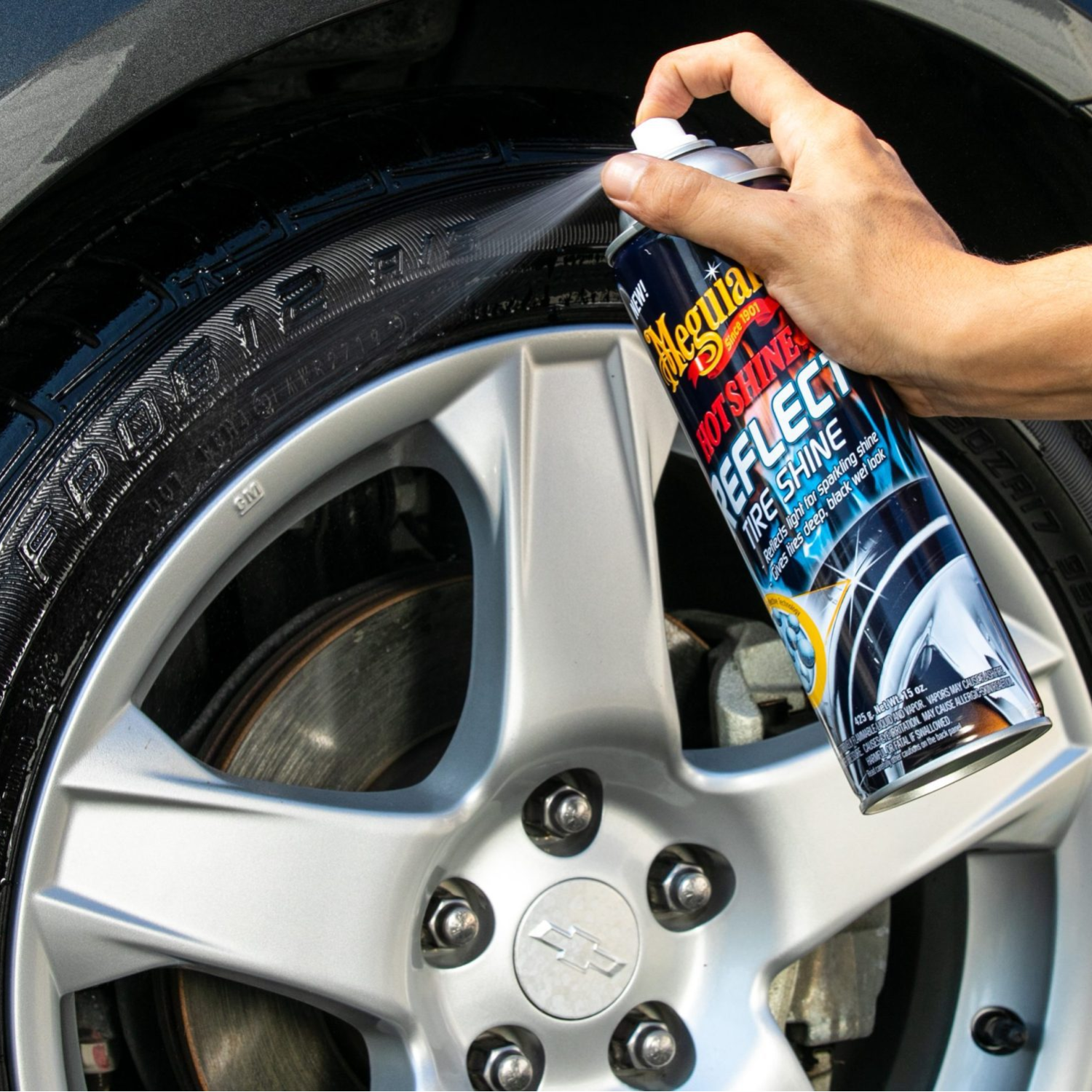 Using a proprietary reflective technology, we have created a tire dressing unlike anything you have ever seen. Meguiar's® Hot Shine Reflect Tire Shine delivers the same deep, black wet look shine that you love yet when light hits your tires you get a unique, sparkling shine. Our exclusive formula levels evenly and quickly to prevent streaking, then bonds to the tire to create a long-lasting shine. Lesser products drip and run, leaving unsightly streaks and marks when they dry. Hot Shine Reflect includes water resistant polymers, enhanced resin technology and premium silicones to protect and keep your tires black & shiny for weeks.