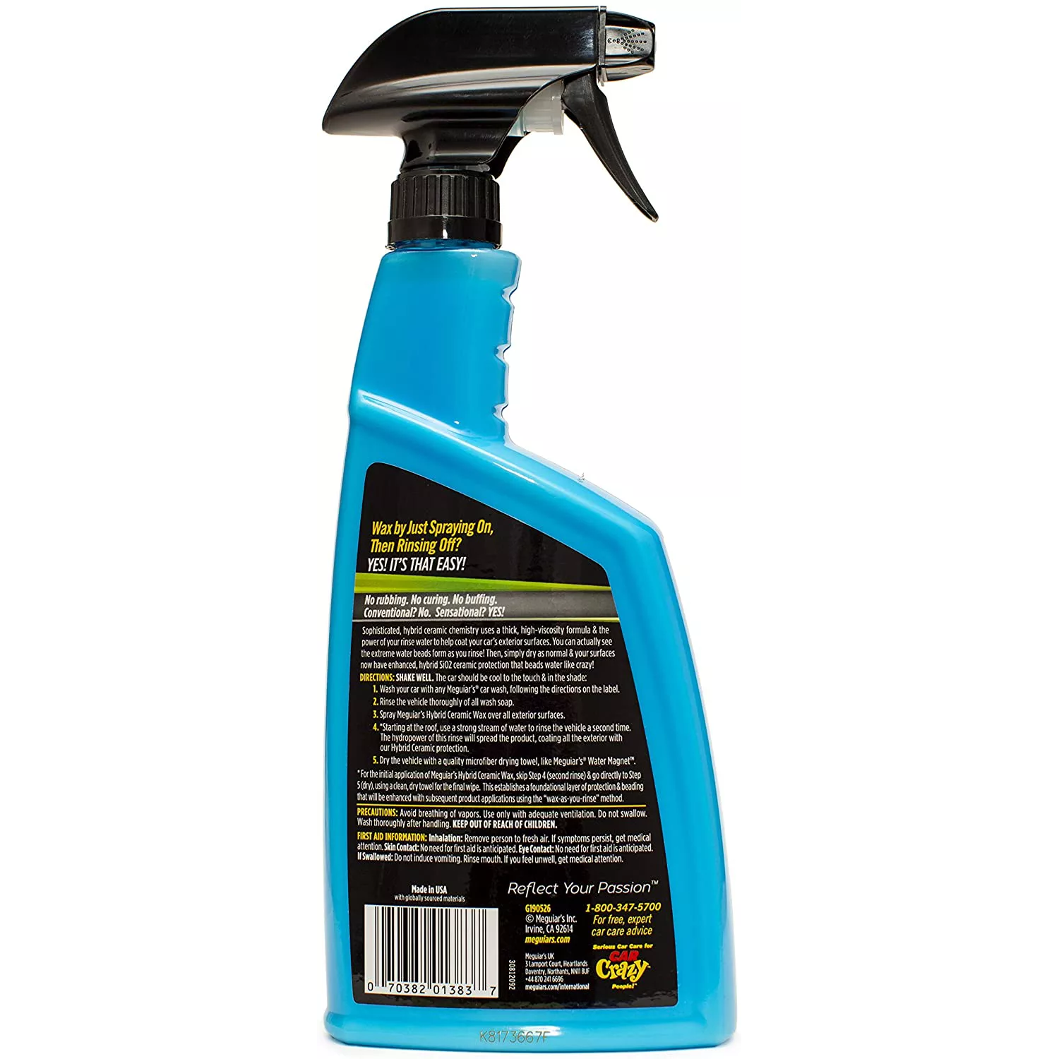 Do you want an easy to use car wax that with cutting-edge, sophisticated technology that delivers the latest in protection? Meguiar’s® Hybrid Ceramic Wax is the answer. With all-new, advanced SiO2 hybrid technology you get ceramic protection that’s so easy to use, you can actually wax your paint as you rinse off your car! After washing & rinsing off the soap, simply spray on Meguiar’s Hybrid Ceramic Wax and then follow that with a second rinse with a strong stream of water. This final rinse helps to spread and lay down the wax evenly for you. Dry your vehicle like you would normally with a quality microfiber drying towel, like Meguiar’s® Microfiber Water Magnet Drying Towel. There’s no rubbing or buffing and there’s no curing time. You’re left with ceramic protection and durability well beyond conventional wax and extreme water beading protection. Conventional? No. Sensational? YES! It’s Ceramic made easy!