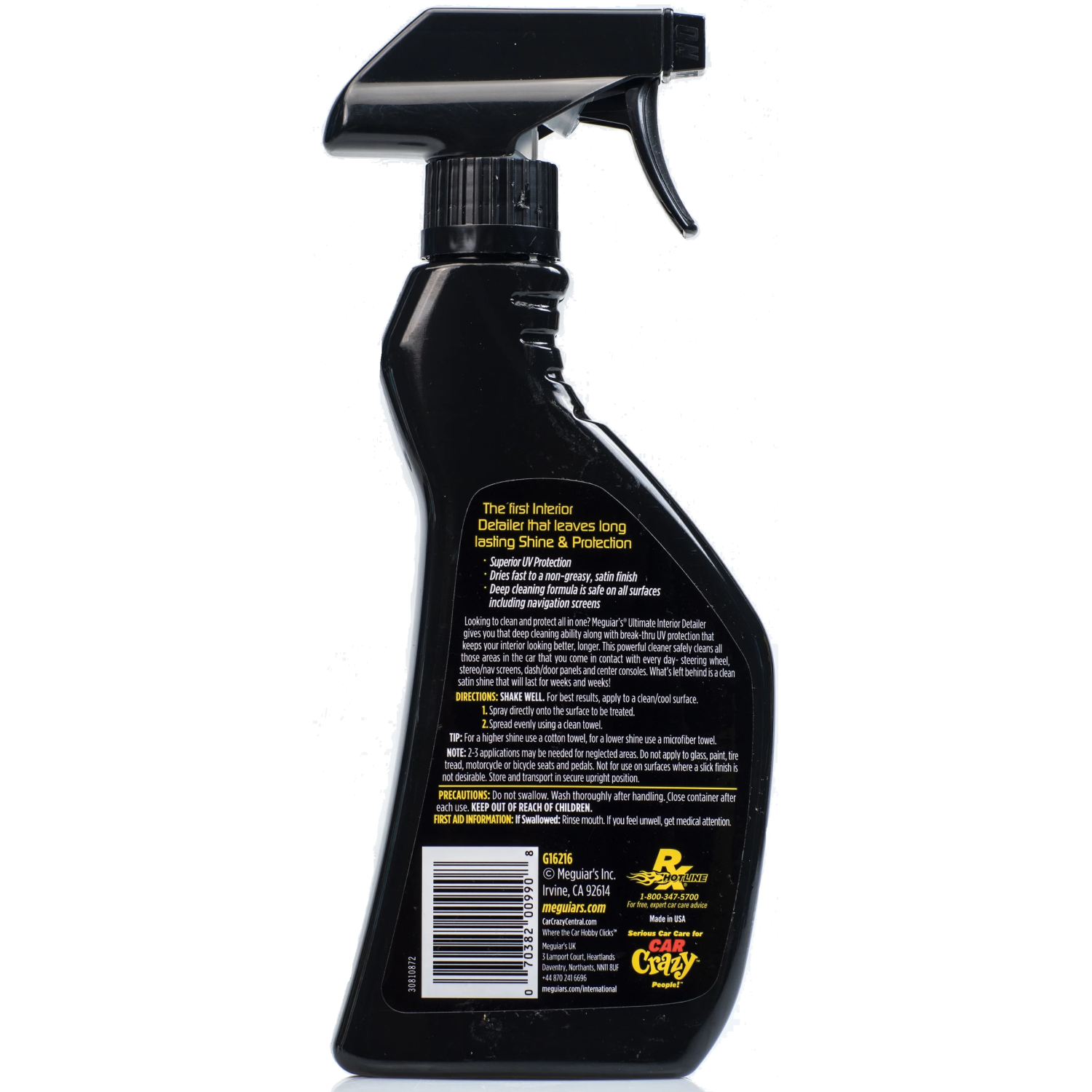 Looking to clean and protect all in one? Meguiar's® Ultimate Interior Detailer gives you that deep cleaning ability along with break-thru UV protection that keeps your interior looking better, longer. This powerful cleaner safely cleans all those areas in the car that you come in contact with every day including; steering wheels, stereo/NAV screens, dash/door panels and center consoles. What's left behind is a clean satin shine that will last for weeks and weeks!