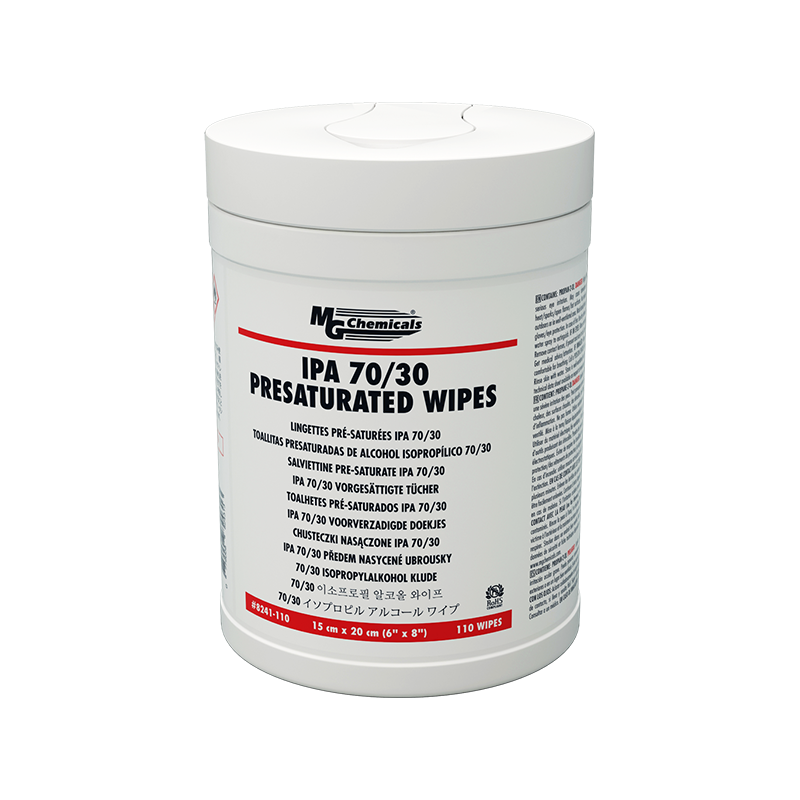 8241-110 is a 70/30 isopropyl alcohol electronics cleaner. The liquid is fully miscible with water and with a large variety of organic solvents, which makes it good at dissolving dirt, dust, greases, and light organic contaminants. It is quick-drying relative to water, and leaves no residue. As it dries, it gives off a light alcohol odor, which is not bothersome and serves as a cue to limit over-exposure due to poor ventilation.Because 8241-110 Wipes are safe for paints, metals, and plastics they are used to clean a wide range of electronic equipment and peripherals, and to wash off harsh organic solvents like acetone that might damage the substrate surface.