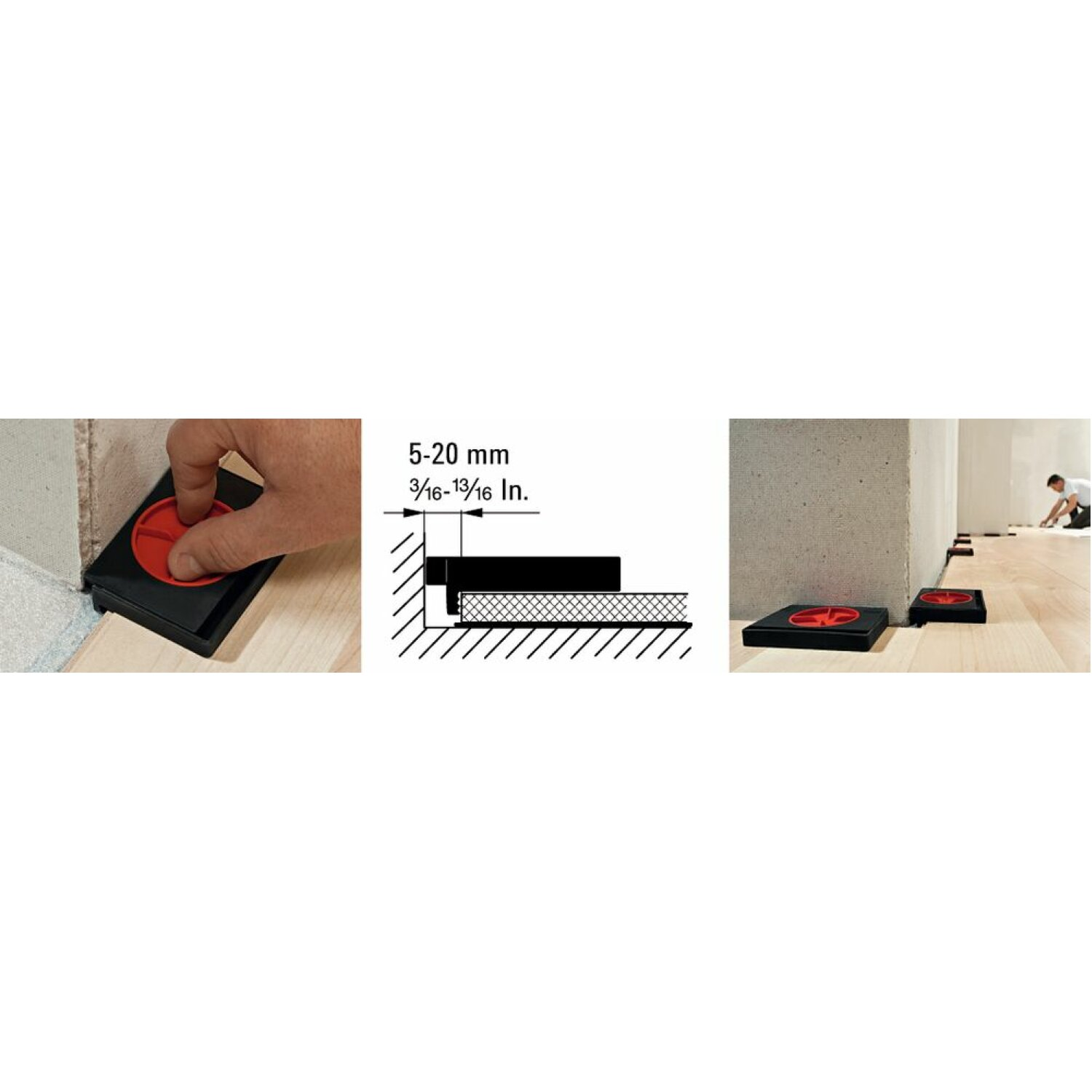 Simply insert between the wall and the first row of flooring. Adjustable to compensate for wall irregularities and removal is a quick turn of the dial to release pressure.