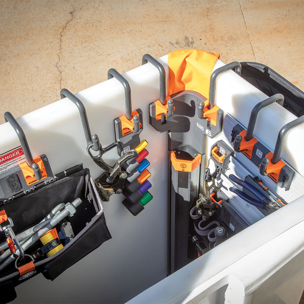 - S-Hook modules are hung horizontally across the rim of an aerial bucket to maximize space