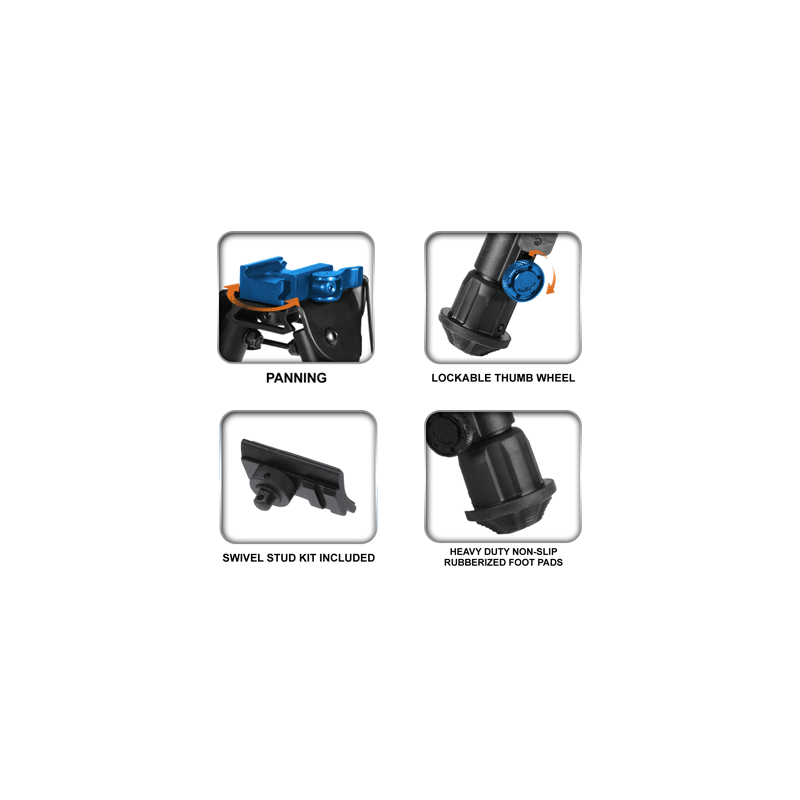 • Heavy-duty Full Metal Construction to Meet Harshest Requirements • Mount Base with Fully Adjustable Quick Detach Lever Lock to Fit on Any Picatinny and Weaver Rail • Includes Swivel Stud Kit for Swivel Stud Mount Application • Fully Adjustable Leg with 3 Extension Notches for Most Secured Extension Positions, Further Supported by Lockable Thumb Wheel for Finer, Precision Extension Adjustment • Finger-friendly Push Buttons for Rapid Retraction of Leg Extensions • Foldable Arms with Robust External Spring Tension Control • Unique Non-slip Rubberized Foot Pads for Any Terrain or Surface