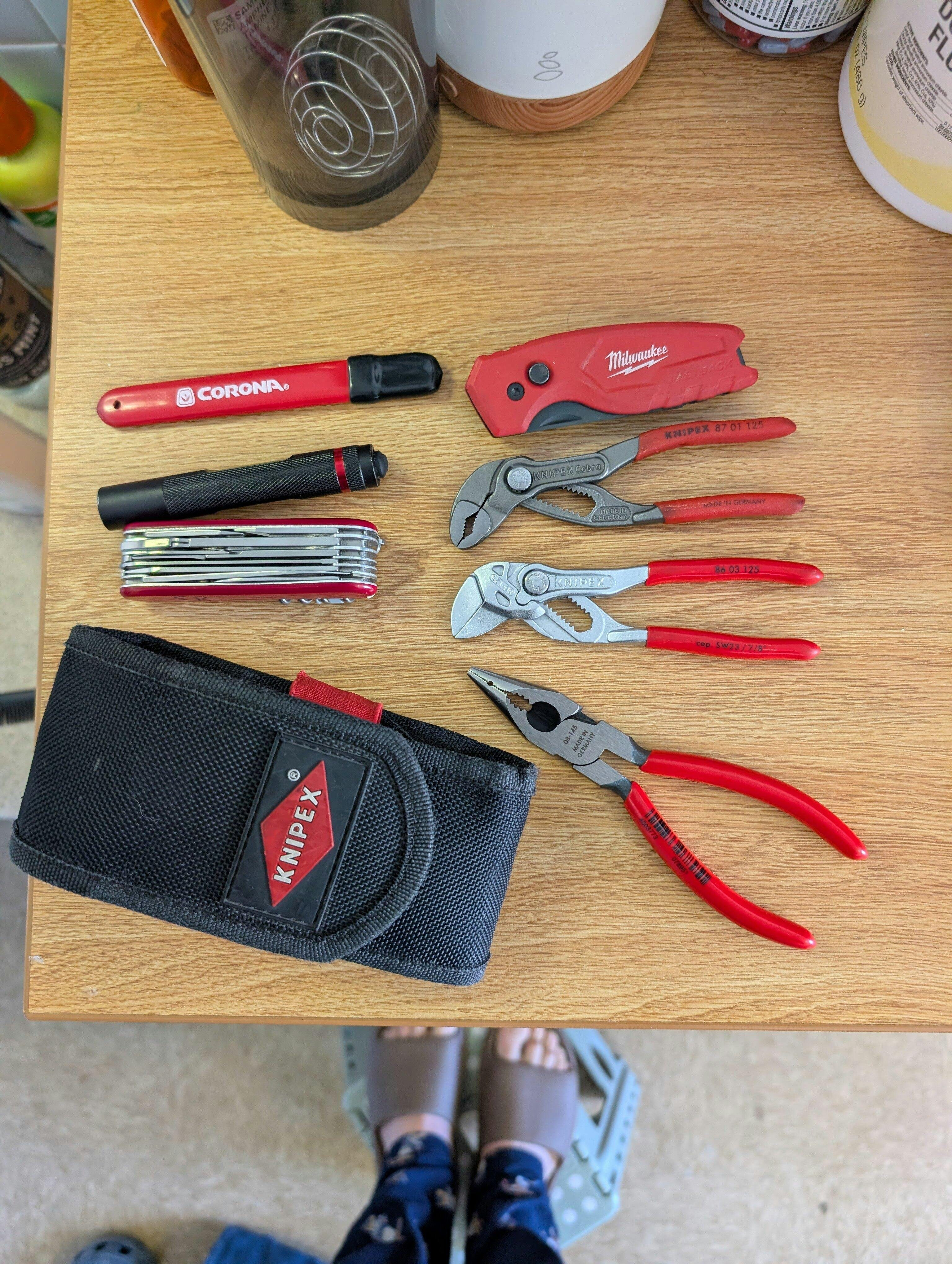 I purchased this pair of pliers as a sort of "everyday carry". I own the 125mm pliers wrench and cobras, but I wanted something that I could use on finer things, so I purchased this pair of needle nose pliers. They're probably my most used pair of pliers at this point. If there's a problem, they're my go-to, until I have to break out a real toolkit. (Below you can see the tools I carry around as someone who does maintenance for an arborist company(images 4 & 5: I have these pliers, the aforementioned 125mm cobra/pliers wrench combo, a basic flashlight, a Victorinox Handyman, a simple carbide tool sharpener, and a Milwaukee Fastback, I find that this setup (with a multi-bit screwdriver) can handle anything I see myself doing on a regular basis.)