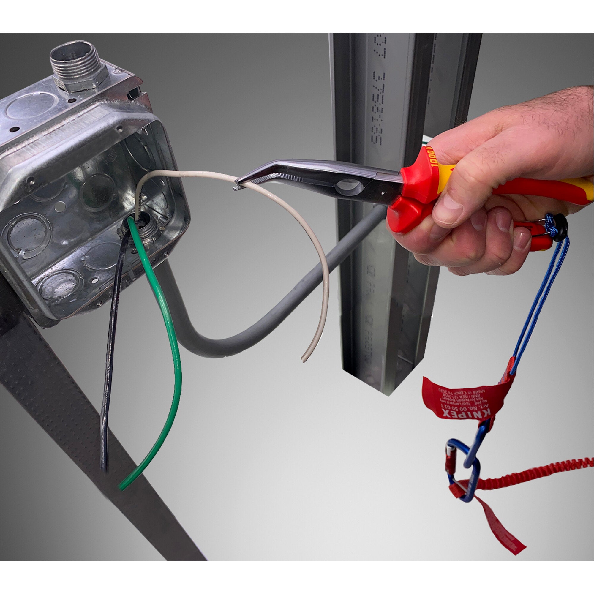 Elastic tips; stable even when twisted. Distortion-tolerant, flexible precision tips. Half-round, long, pointed jaws. Snipe nose side cutting pliers also known as stork beak pliers. Hardened cutting edges (approx. 61 HRC) for soft, medium hard and hard wire. Slim long nose is ideal for working in confined areas. Vanadium steel; forged, multi stage oil-hardened, chrome finish. 1000V multi-component grips, VDE-tested. Includes tether attachment point. For use with KNIPEX Tethered Tools System.