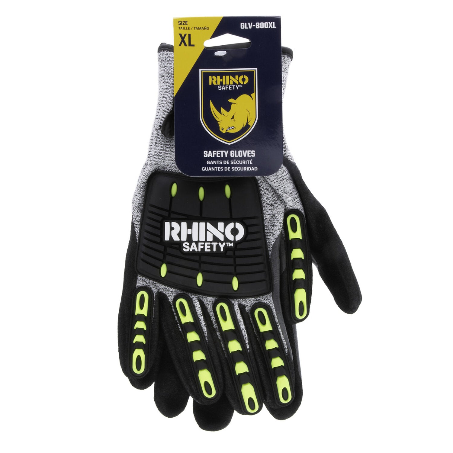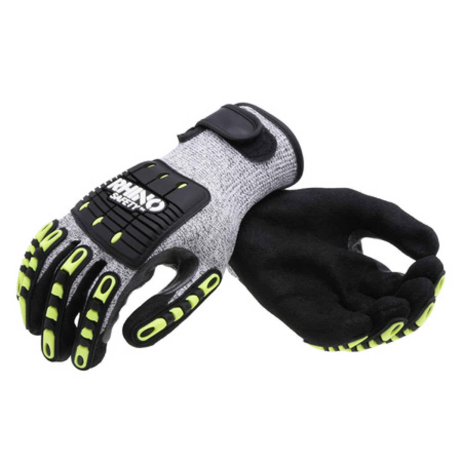 RHINO provides safety on the jobsite and beyond. These 13-gauge white and black HPPE nylon safety gloves protect your hands and improve your grip, with a sandy nitrile coating on the palm and fingers that resists abrasion, oils and chemicals.