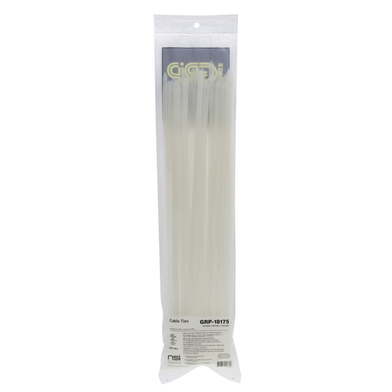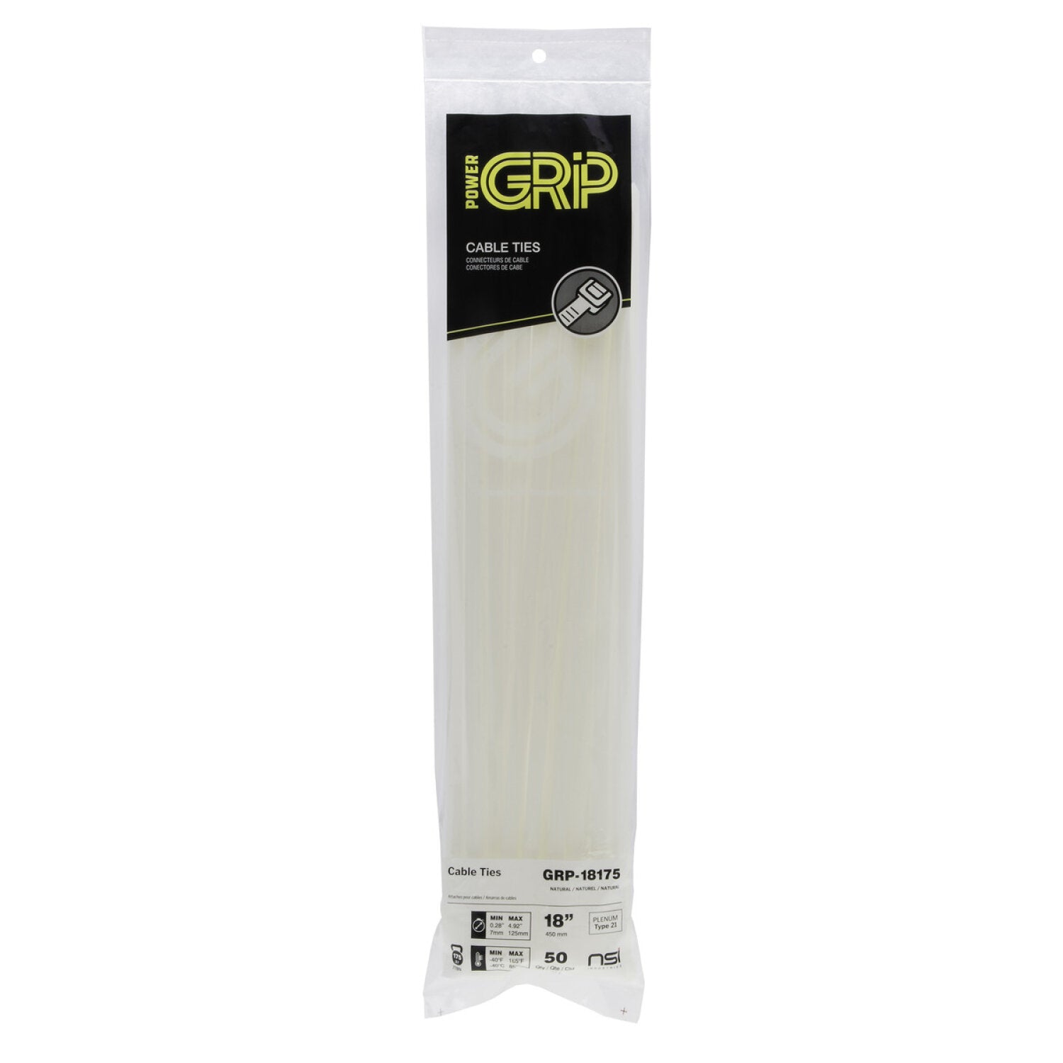 NSI GRP-18175 18”, Natural Super Heavy-Duty 175lb Cable Ties, 50 Pack