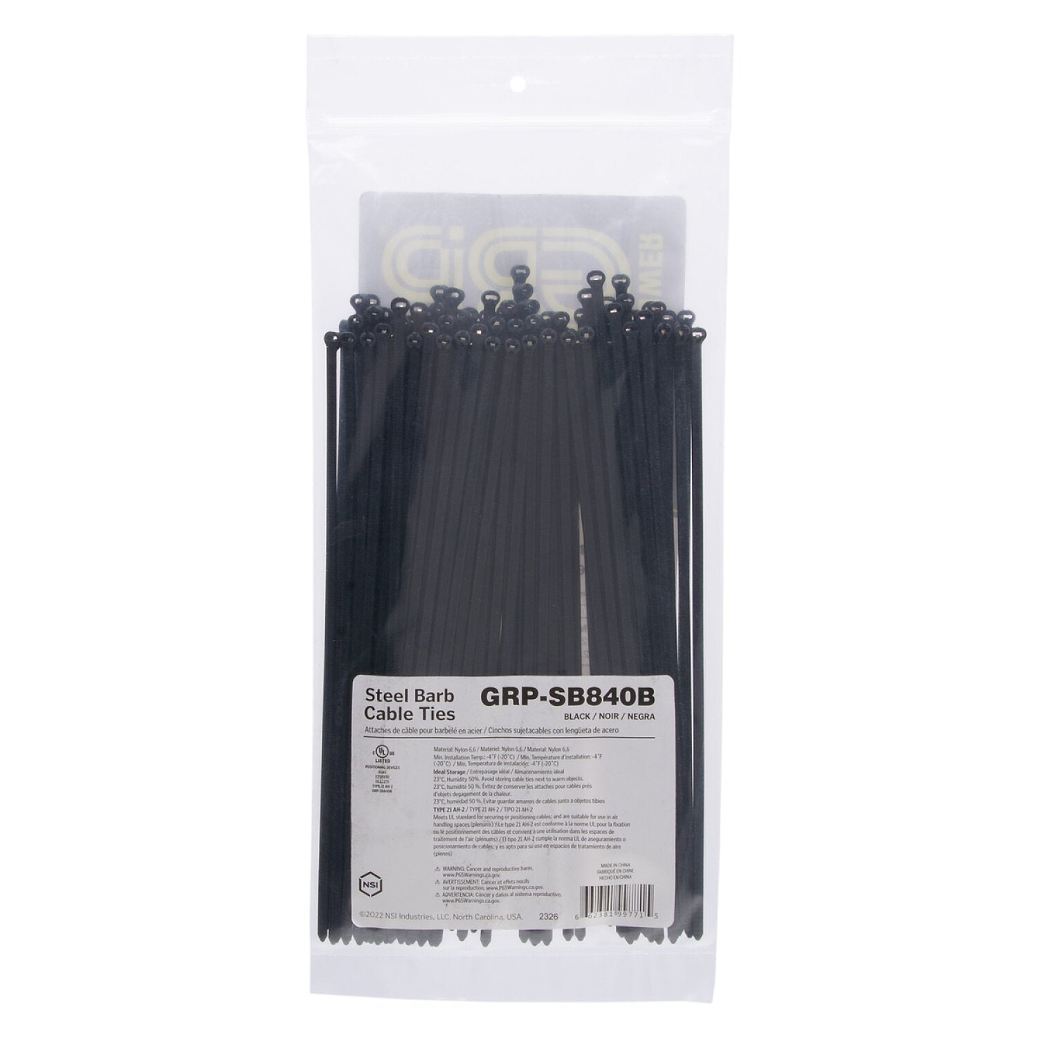 NSI GRP-SB840B 8”, Black Steel Barb 40lb Cable Tie, 100 Pack