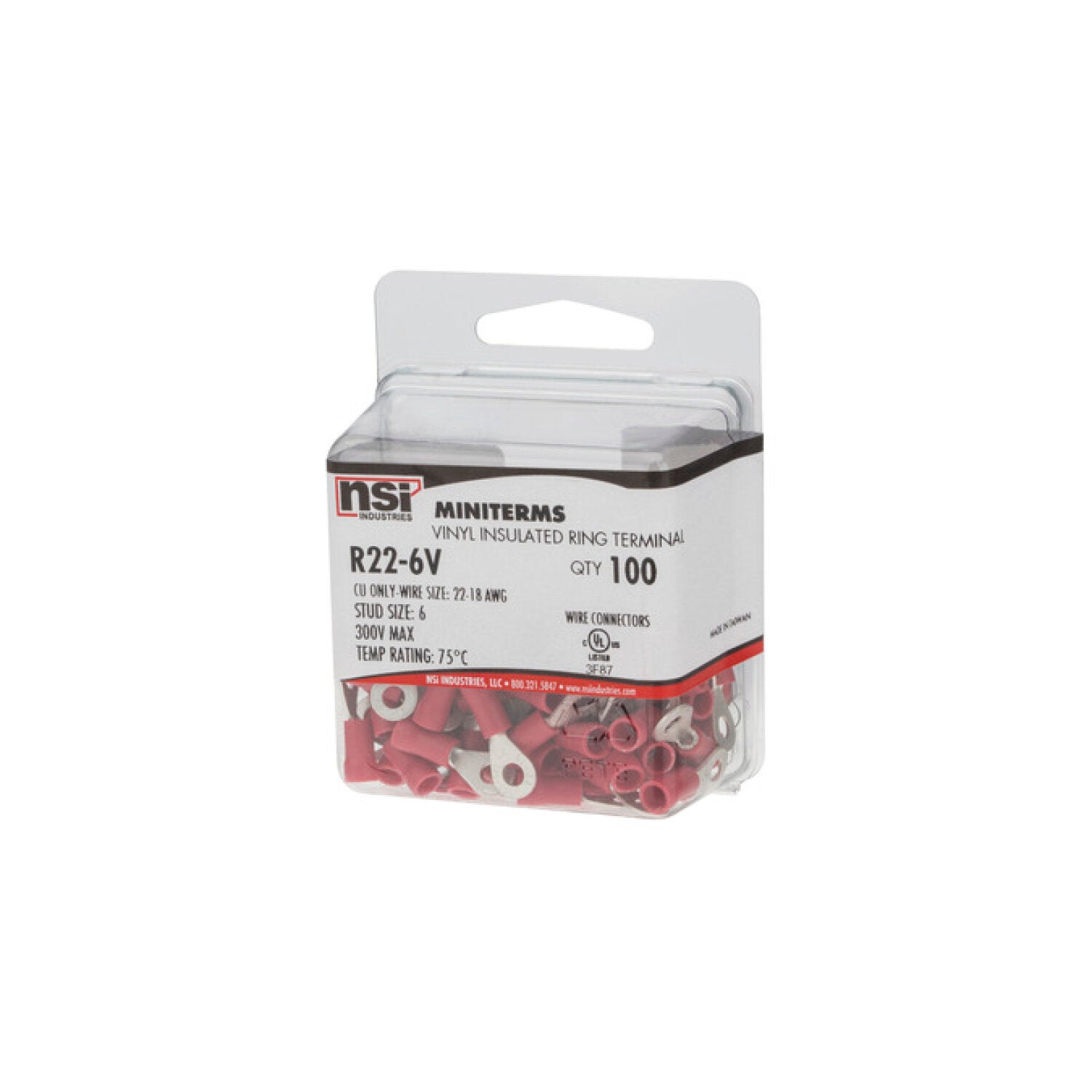 NSI R22-6V 22-18 Awg Vinyl Insulated Ring #6 Stud 100 Per Pack