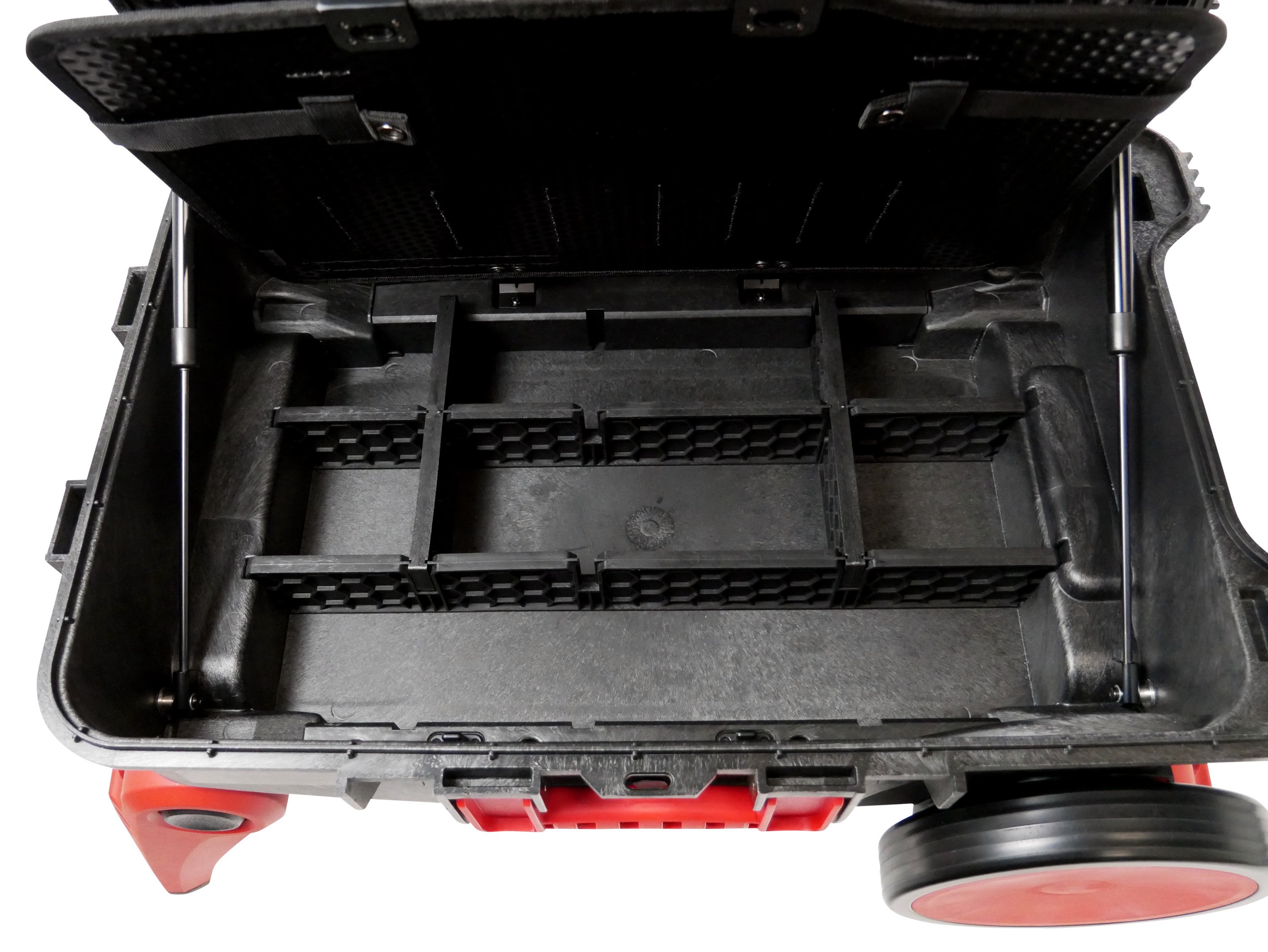 The case offers enormous storage space with over 100 storage compartments coupled with lightweight and robust polypropylene construction for durable everyday use. Maneuvering the case is no problem with top and side grab handles for one or two-handed lifting and carrying. Have a long way to walk to the worksite? Thanks to the case's pull handle (extendible to 42-inches) and extra-large wheels it's easy to conveniently pull the case while climbing stairs and traversing rough terrain.