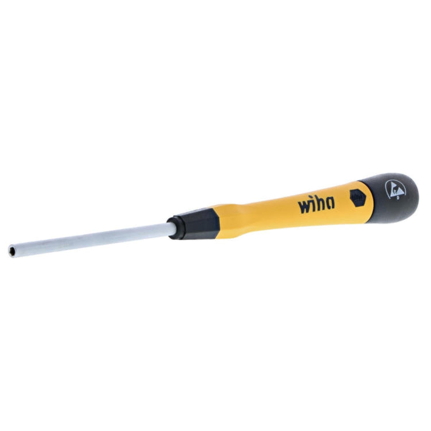Wiha ESD Safe PicoFinish® Precision Drivers are the standard for premium quality featuring ergonomic cushion grip handles for comfort and control, dual durometer construction for long-lasting durability, and handles directly molded to the blade for a permanent bond. The PicoFinish® style includes a hex profile finger grip for precise torque and control, a tapered handle for rapid rotation, and an extra-long cap for optimal hand positions and smooth turning. The handles are sized proportionately to the blade for consistent mechanical advantage and have driver tip profiles labeled on the cap for easy identification. Wiha ESD Safe PicoFinish® Precision Drivers consist of Wiha premium quality tool steel engineered for strength and durability, have a chrome-plated satin finish for corrosion protection, and feature exact fit precision machined tips for reduced cam-out. Wiha ESD safe precision tools meet ESD Standard IEC 61340-5-1 for protecting electronic devices from electrostatic discharge and have a handle surface resistance of 106 - 109 Ohms for balanced electrostatic dissipation. Wiha premium quality ESD Safe PicoFinish® Precision Drivers are designed and engineered by Wiha Germany and manufactured in Germany. You can invest with confidence knowing that this product is backed by the Wiha No Hassle Guarantee.