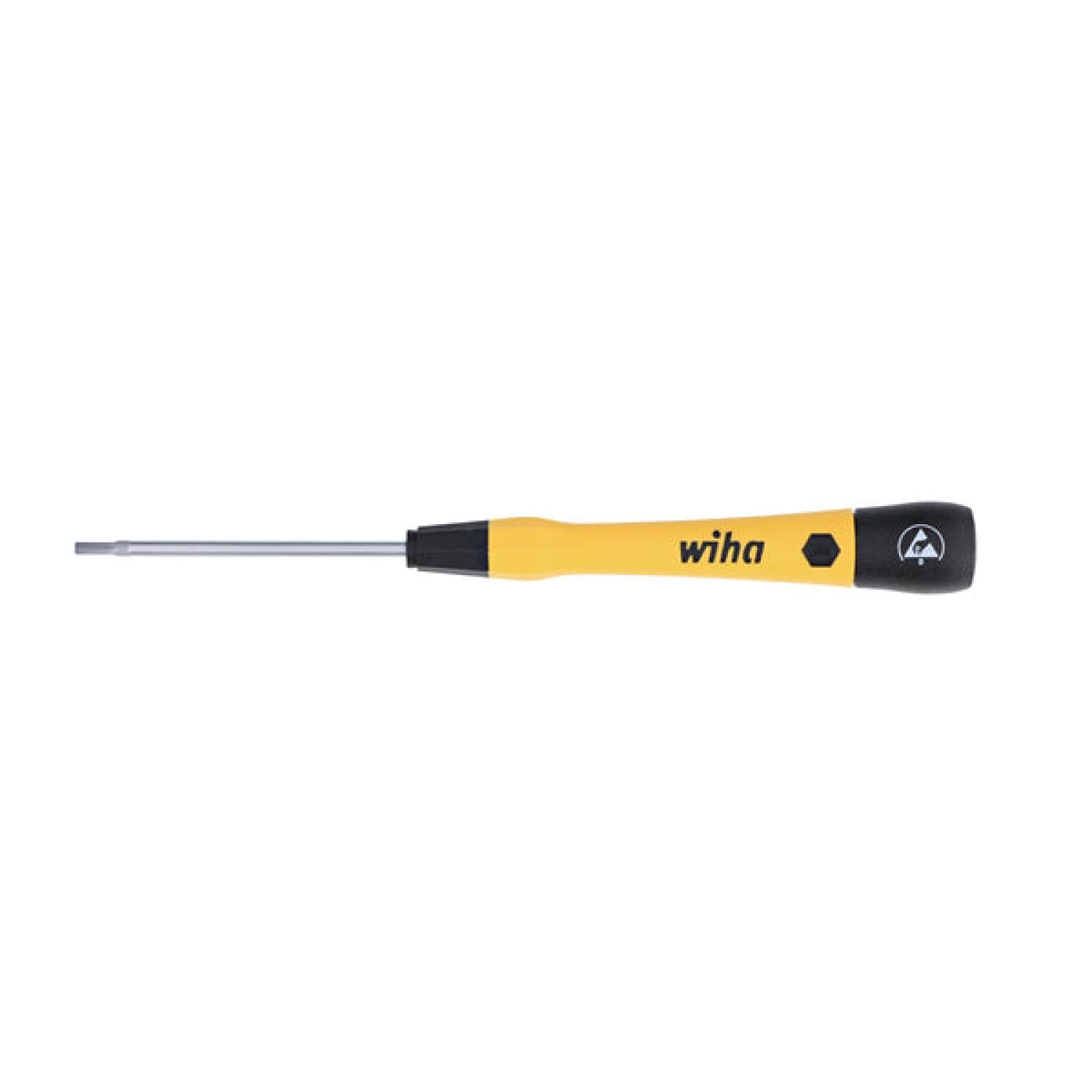 Wiha ESD Safe PicoFinish® Precision Drivers are the standard for premium quality featuring ergonomic cushion grip handles for comfort and control, dual durometer construction for long-lasting durability, and handles directly molded to the blade for a permanent bond. The PicoFinish® style includes a hex profile finger grip for precise torque and control, a tapered handle for rapid rotation, and an extra-long cap for optimal hand positions and smooth turning. The handles are sized proportionately to the blade for consistent mechanical advantage and have driver tip profiles labeled on the cap for easy identification. Wiha ESD Safe PicoFinish® Precision Drivers consist of Wiha premium quality tool steel engineered for strength and durability, have a chrome-plated satin finish for corrosion protection, and feature exact fit precision machined tips for reduced cam-out. Wiha ESD safe precision tools meet ESD Standard IEC 61340-5-1 for protecting electronic devices from electrostatic discharge and have a handle surface resistance of 106 - 109 Ohms for balanced electrostatic dissipation. Wiha premium quality ESD Safe PicoFinish® Precision Drivers are designed and engineered by Wiha Germany and manufactured in Germany. You can invest with confidence knowing that this product is backed by the Wiha No Hassle Guarantee.