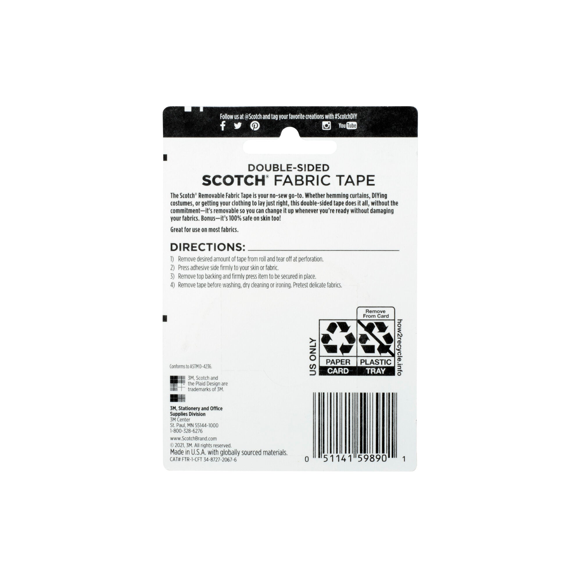 Scotch Permanent Fabric Tape Strips FAP-1-CFTPScotch® Removable Fabric Tape featuring a unique adhesive that holds fabric securely, yet is easy to remove or reposition. It's great for layouts and crafting. It can be written on with pen, pencil or marker and will not dry out or yellow . The tape pulls off the roll smoothly and cuts easily. This roll is 3/4 in. x 180 in. with a 1 in. core . Scotch Removable Fabric Tape made in the USA with globally sourced materials.