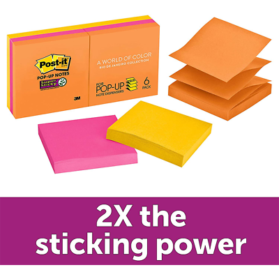Post-it® Super Sticky Pop up Notes in 3 in x 3 in feature 2x the sticking power. These accordion style notes are specially designed to work in Post-it® Pop up Note Dispensers, and allow you to always have a note nearby to capture great ideas. Unique adhesive reliably sticks and re sticks so your message can stay front and center. Move your notes with you throughout the day. Use for notes or reminders on doors, windows or walls. A World of Color Rio de Janeiro Collection expresses dramatic colors that celebrate this Brazilian metropolis. 6 Pads/Pack, 90 Sheets/Pad.