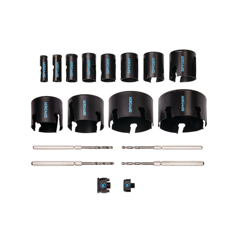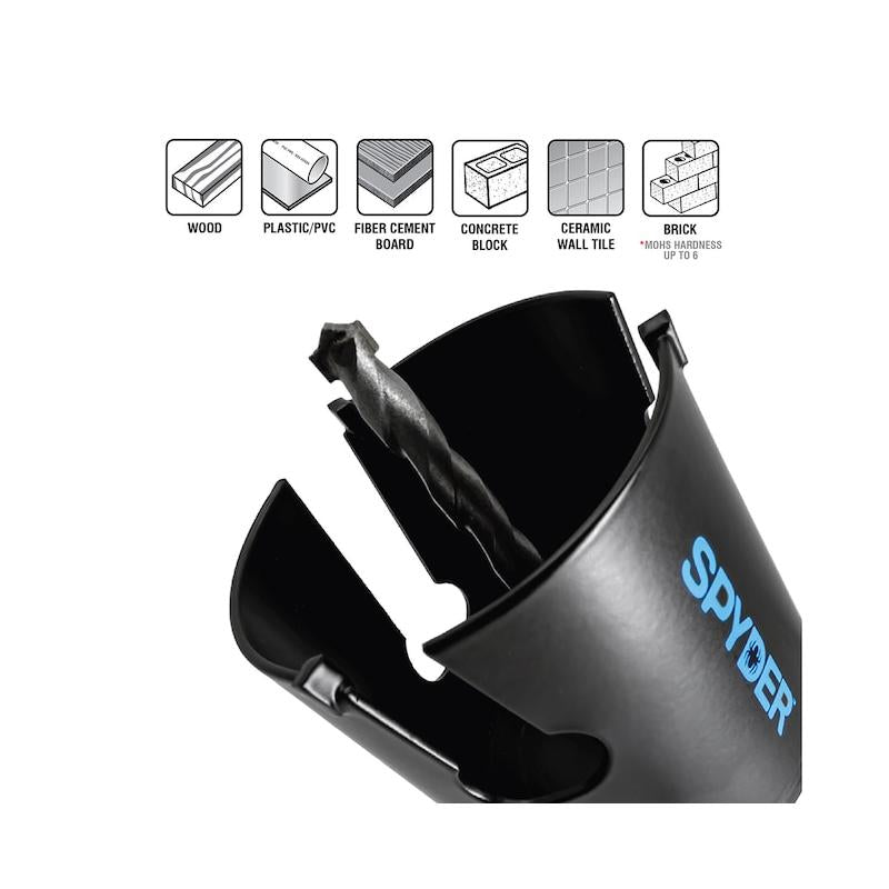Spyder's Tungsten Carbide-Tipped (TCT) hole saws cut more materials up to 5x faster and make up to 10x more cuts — lasting longer than conventional bi-metal hole saws. TCT hole saws drill through wood, MDF, fiber cement board, porous concrete block, ceramic wall tile, plastic/PVS and more. Use with Spyder's Rapid Core Eject arbor system to remove cores without prying (drill hole, press button, pull back the hole saw, and eject the core), cut at an angle, and enlarge existing holes using two adapters on one pilot bit . All TCT, Tarantula, and Bi-Metal hole saws fit on Spyder Rapid Core Eject arbors and pilot bits (sold separately), and on universal hole saw arbors. Spyder's TCT hole saw is the pro's choice for innovation, high performance, speed, and versatility — drill more holes in more materials in less time. Not for use in hammer mode, or for drilling metal, wood with nails, harder, abrasive materials, or block/brick/tile applications with a Mohs hardness of 6 or greater. Always use a drill with a support handle. 18-piece kit contains (12) hole saws: 3/4, 7/8, 1-1/8, 1-3/8, 1-3/4, 2, 2-1/2, 2-5/8, 3, 3-5/8, 4-1/8, 4-1/2; (4) pilot bits: Hex10 TCT, Hex10 HSS, Hex8 TCT, Hex8 HSS; and (2) arbors: Hex8 and Hex10, in a hard storage case.