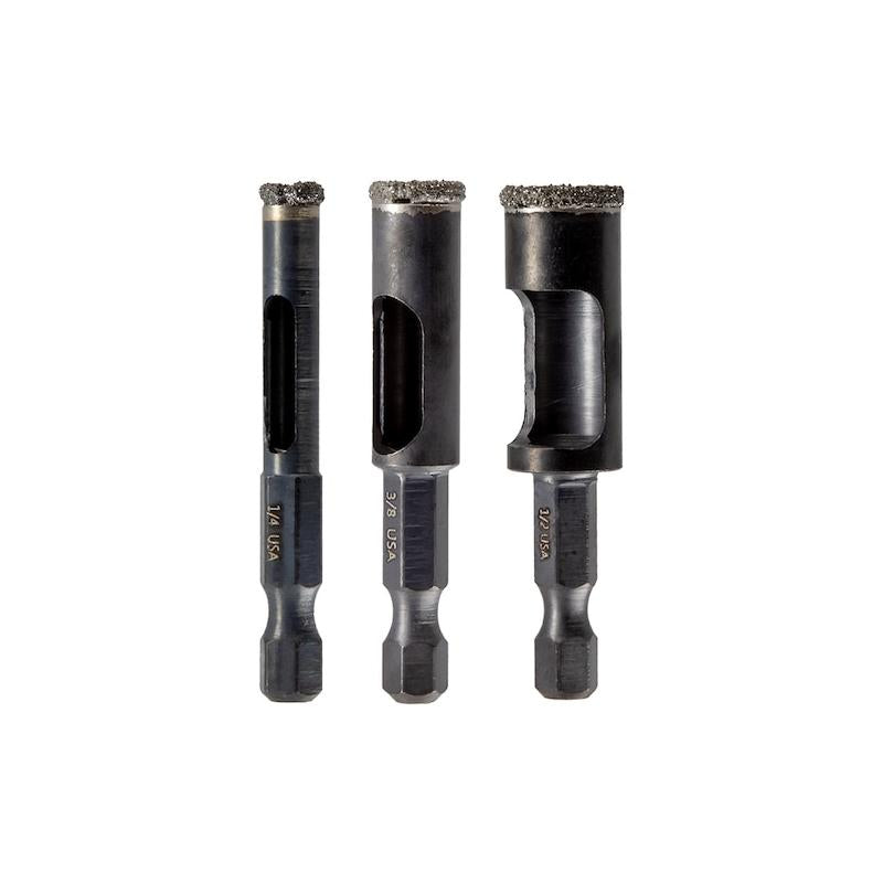 Spyder diamond hole saws are the professional choice for hole-making in tile, glass and masonry materials. Premium boron coated industrial diamond abrasive self-sharpens for quick cuts and long - up to 20x more holes than standard diamond hole saws and up to 10x faster than standard glass and tile bits. A high temperature nickel braze adheres at temperatures up to 1.5x the temperature of braze used on standard diamond hole saws - increasing diamond abrasive retention and saw life. Oversized core removal slot enables easy side evacuation of the core, without tools or prying (for materials up to 5/8-in in depth). A 1/4-in speed hex won’t slip in the chuck. Heavy duty single piece construction and vacuum furnace heat treated high-alloy steel provides a reliable cut and consistent, round holes. These saws can be used wet or dry – water spray or immersion will increase tool life, reduce dust and debris, and will create a more quiet cut. Spyder's diamond hole saws are for use on ceramic, porcelain, granite, slate, marble, glass, cement fiber board, laminates and more; with a 1-1/8-in total depth of cut. Made in the USA. Set contains 1/4-in, 3/8-in and 1/2-in diamond abrasive hole saw bits.