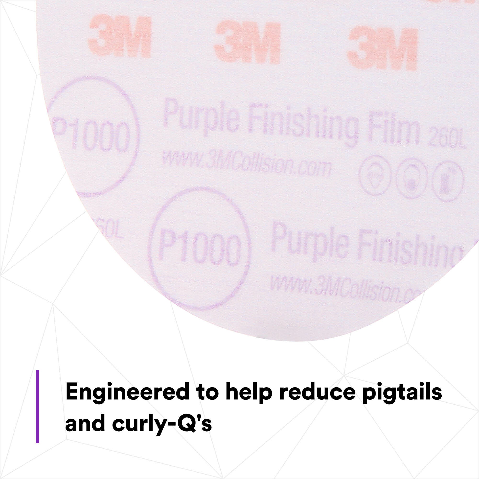 The 3M Hookit Purple Finishing Film Abrasive Disc 260L features an updated coating that levels surface defects on clear coat and greatly reduces pigtails. Aluminum oxide abrasive cuts fast, lasts a long time, resists loading with or without hole pattern designs and leaves a consistent, easy-to-polish finish. The 3M Hookit attachment system makes disc change-outs fast and easy.For a Better Finish, Start Here
