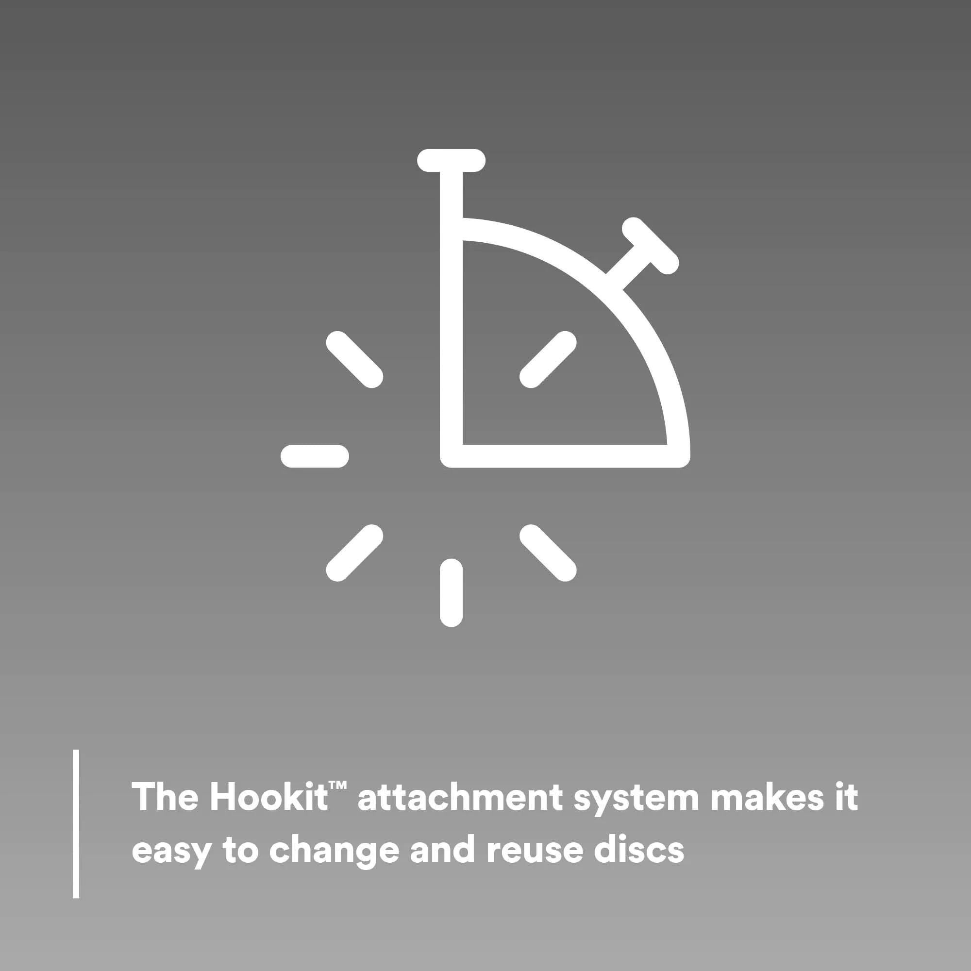 • Hookit™ attachment system makes for fast disc-change-outs and longer disc life
