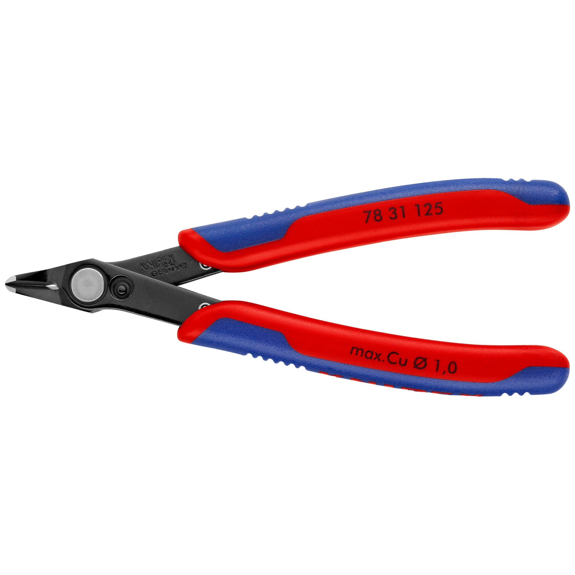Precision pliers for ultra fine cutting work in electronics and fine mechanics. Ground, very sharp cutting edges without bevel for flush cutting perfect for cable ties. Precision shaped tips cut wires resting on a board from 1/64" (0.2 mm) diameter. Joint with stainless steel rivet. Extremely smooth movement for minimum operator fatigue. Includes opening spring for easy repetitive work. Approximately 20% lighter than conventional electronics pliers. Grooves in handle provide a steady grip when applying slight pressure. Narrow head; cutting edges hardness (approx. 60 HRC). Special tool steel, burnished.