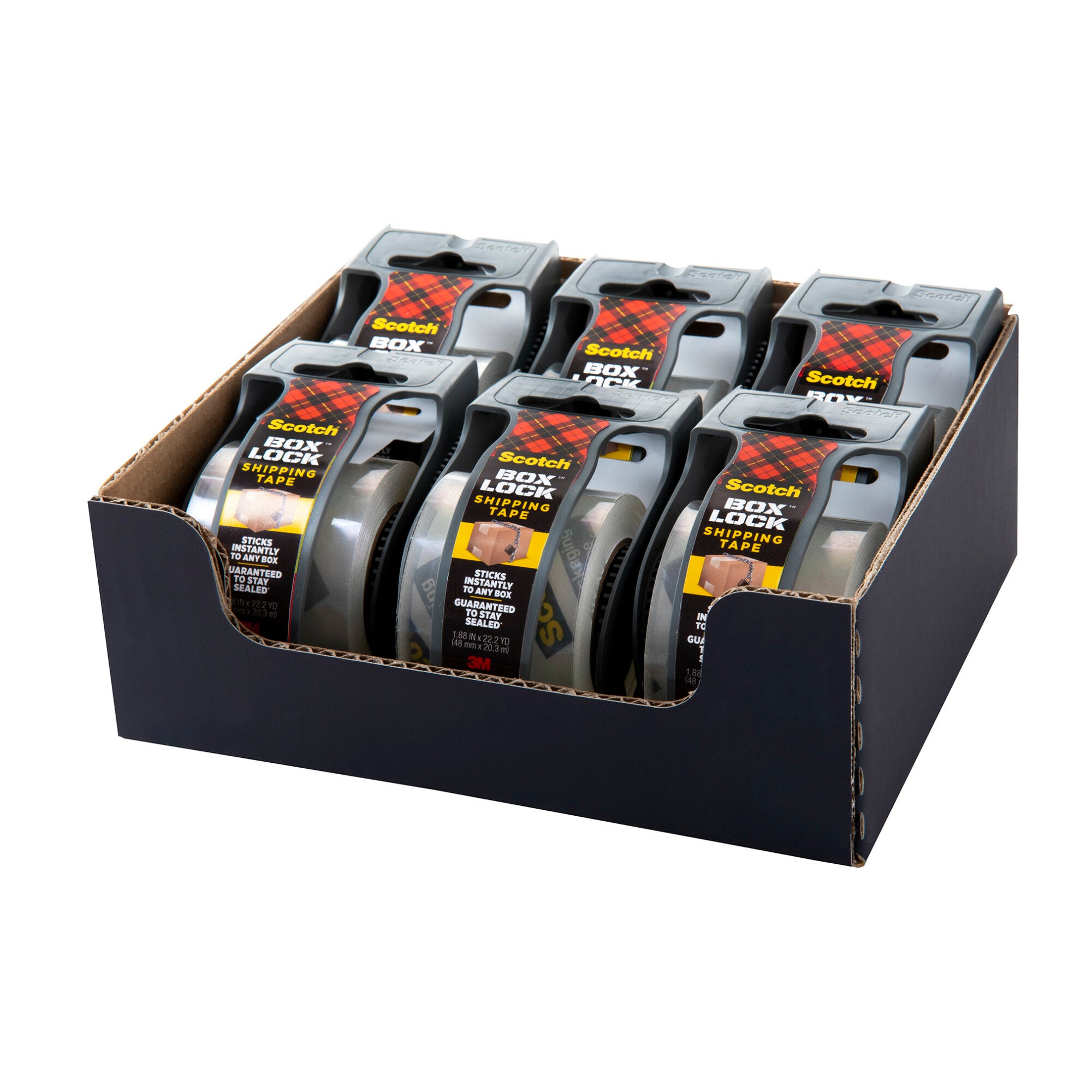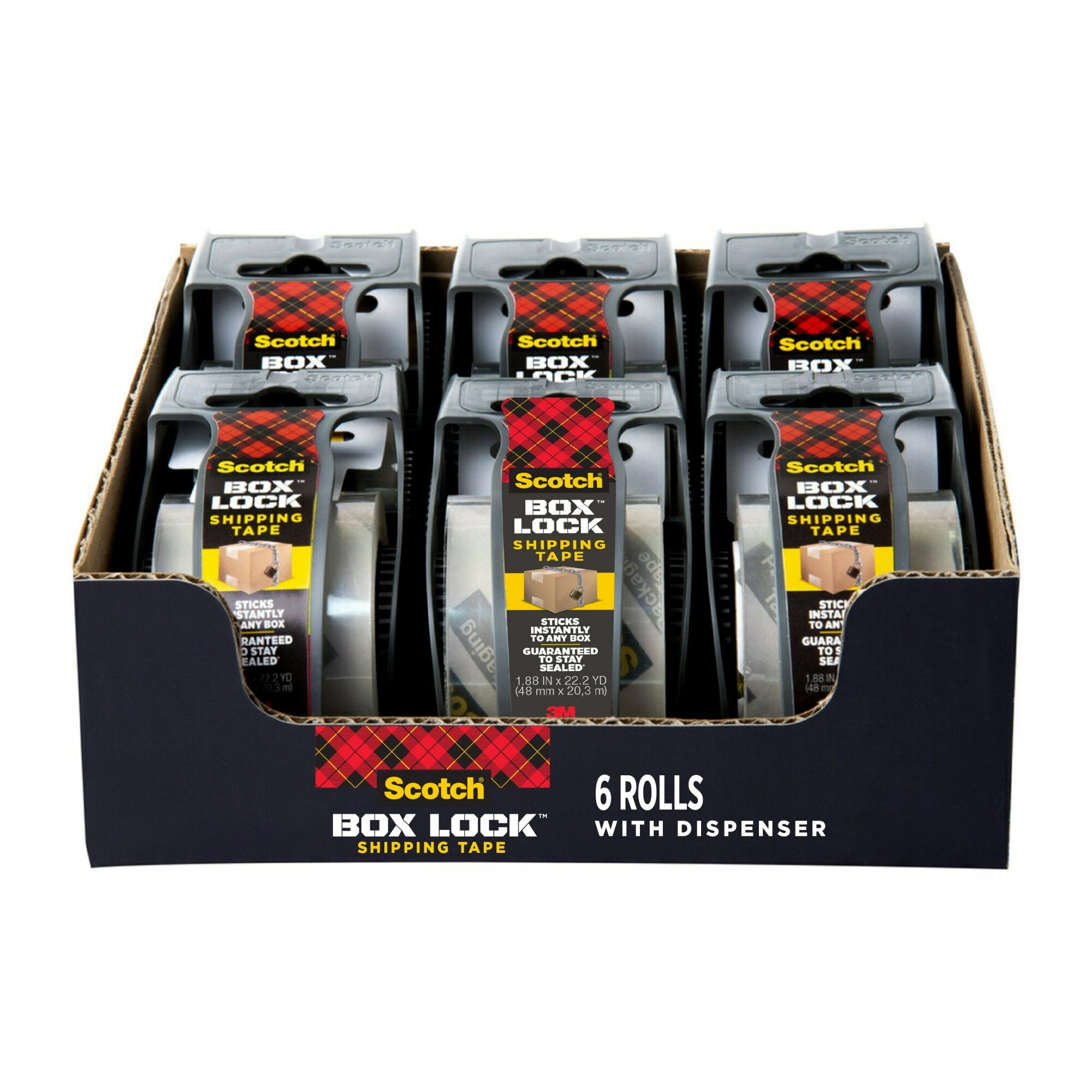 Scotch Box Lock Shipping Packaging Tape sticks instantly with extreme grip to ensure boxes_x000D_ stay securely sealed during rough handling.Scotch® Box Lock™ Packaging Tape sticks instantly to any box! It has the power of extreme grip to ensure boxes stay securely sealed, even during rough handling. Its new advanced adhesive creates a secure seal over box edges, and its thickness and durability reduces splitting and tearing and makes it easier to find the start of the roll. This tape can be used to seal any type of box, including harder-to-stick to 100% recycled boxes.