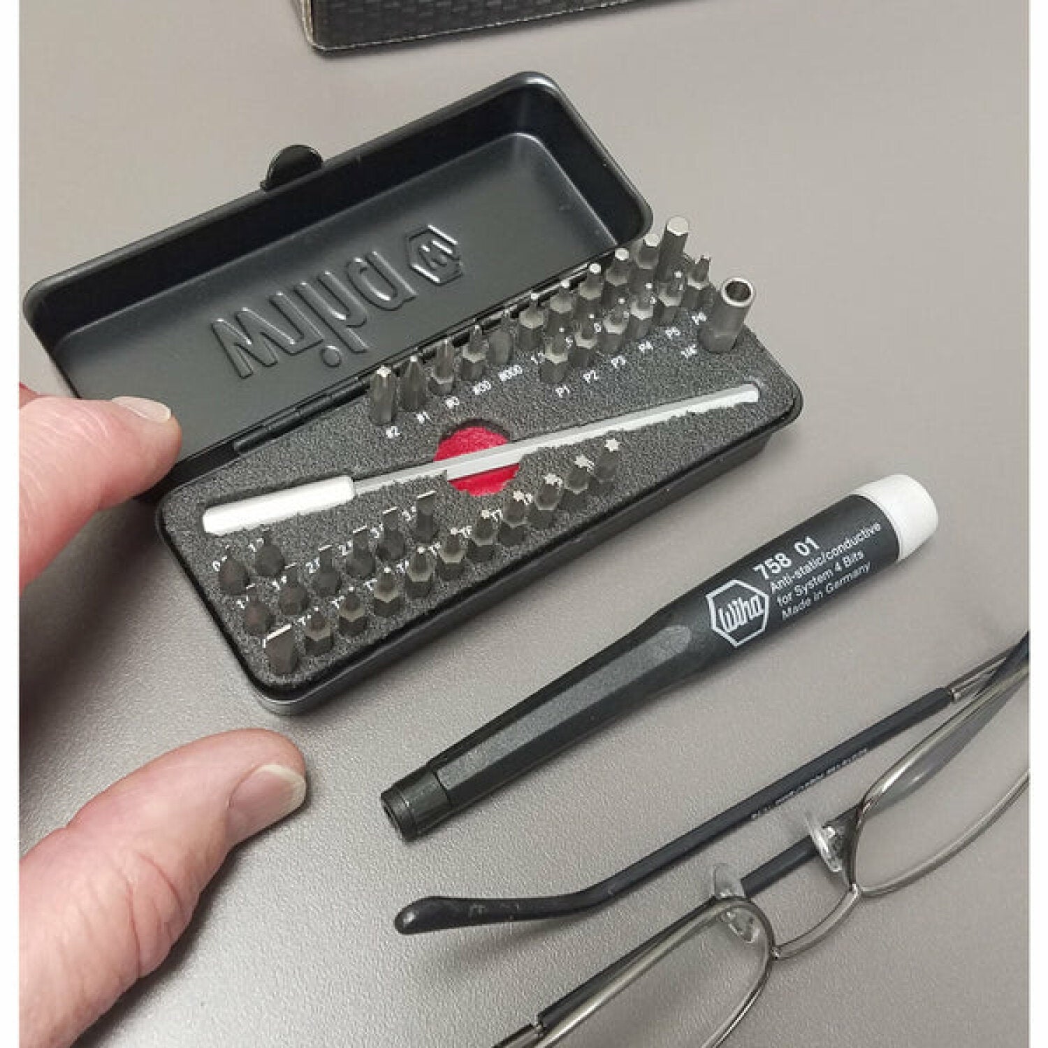 Wiha's 39 Piece GoBox ESD Safe MicroBits Set has the tools to get the job done. The set contains an intelligent selection of micro bits including: Slotted, Phillips, Hex Metric, Torx®, and Pentalobe. The set is equipped with ESD safe MicroBit handle, a 4" MicroBit Extension, and a magnetic hex MicroBit adapter offering the convenience to adapt the tool's configuration. All of the tools come conveniently packaged in a pocketsize secure clasped metal case for easy identification and storage. The set consist of Wiha premium quality tool steel engineered for strength and durability, have a chrome-plated satin finish for corrosion protection, and feature exact fit precision machined tips for reduced cam-out. Wiha ESD safe precision tools meet ESD Standard IEC 61340-5-1 for protecting electronic devices from electrostatic discharge and have a handle surface resistance of 106 - 109 Ohms for balanced electrostatic dissipation.