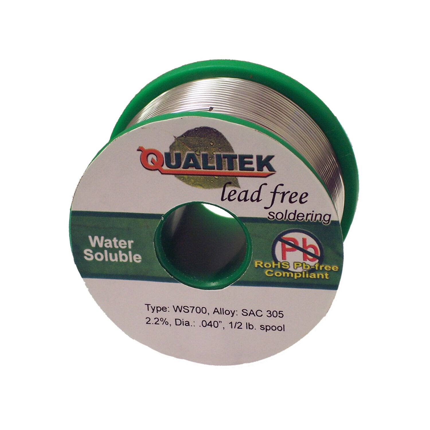 The Philmore 50-96023 WS700 Water Soluble Wire Solder is a 1 lbs. spool of high-quality lead-free solder designed for electronic soldering applications. The solder consists of a blend of tin alloy, silver, and copper with a ratio of 96.5% tin alloy, 3% silver, and 0.5% copper (96.5/3.0/0.5). This composition provides good electrical conductivity and melting properties suitable for electronics work. The solder features a flux core that is 2.2% of the total weight. This material helps clean and prepare the surfaces to be soldered, aiding in the removal of oxidation or other contaminants, and ensuring a strong, reliable solder joint. The diameter of the solder wire is .025 inches and its Gauge is 23 AWG. This product is perfect for soldering components onto printed circuit boards (PCBs), wiring or cable connections, and general electrical repairs and assemblies.