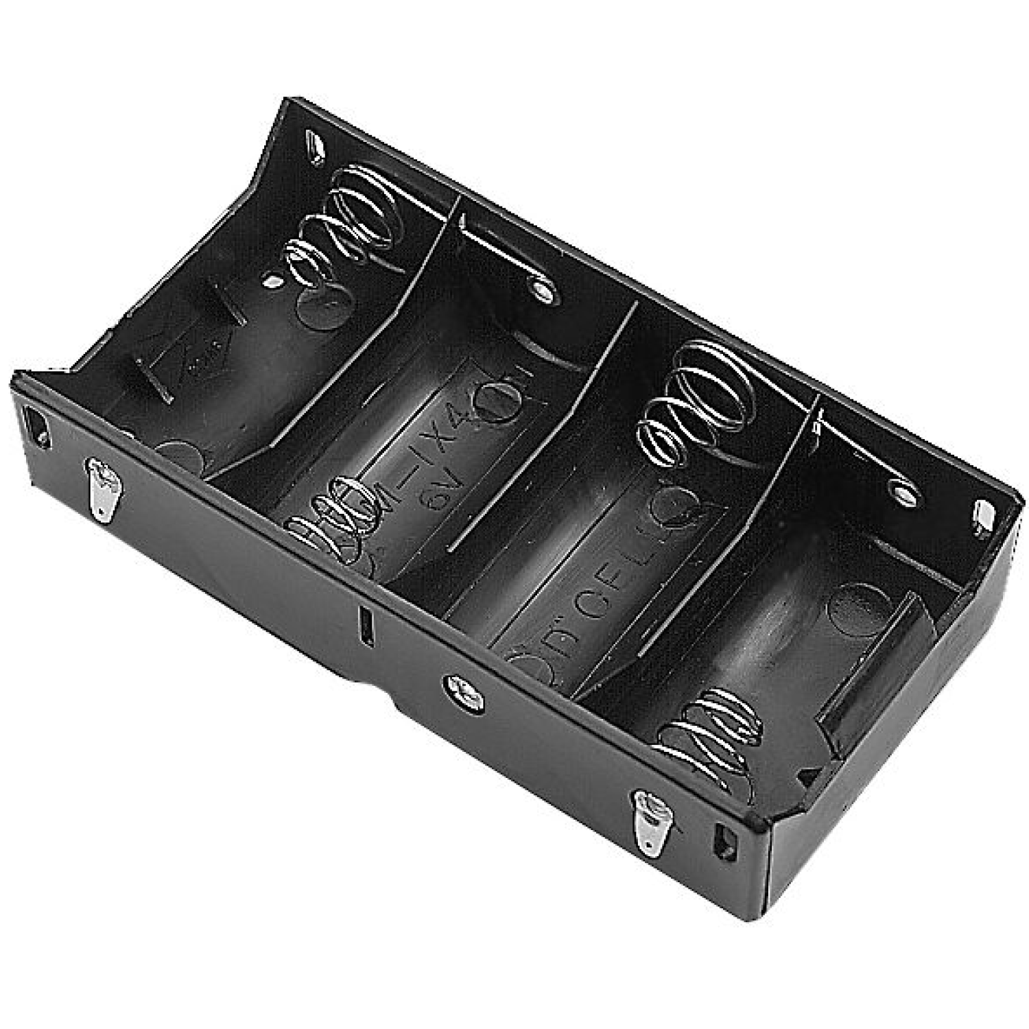 The Philmore BH143 is a durable battery holder designed specifically for D Cell batteries. It is constructed from high-quality plastic materials to ensure long-term durability and secure battery retention. The holder features a compact and lightweight design, making it ideal for various electronic applications, including flashlights, portable radios, and other devices requiring D Cell battery power. The holder consists of a sturdy plastic casing that securely houses four D Cell batteries in a side-by-side configuration. It includes spring-loaded metal contacts that provide a reliable connection to the batteries, ensuring optimal conductivity. The holder also features clearly marked positive (+) and negative (-) terminals for easy battery installation and polarity identification.