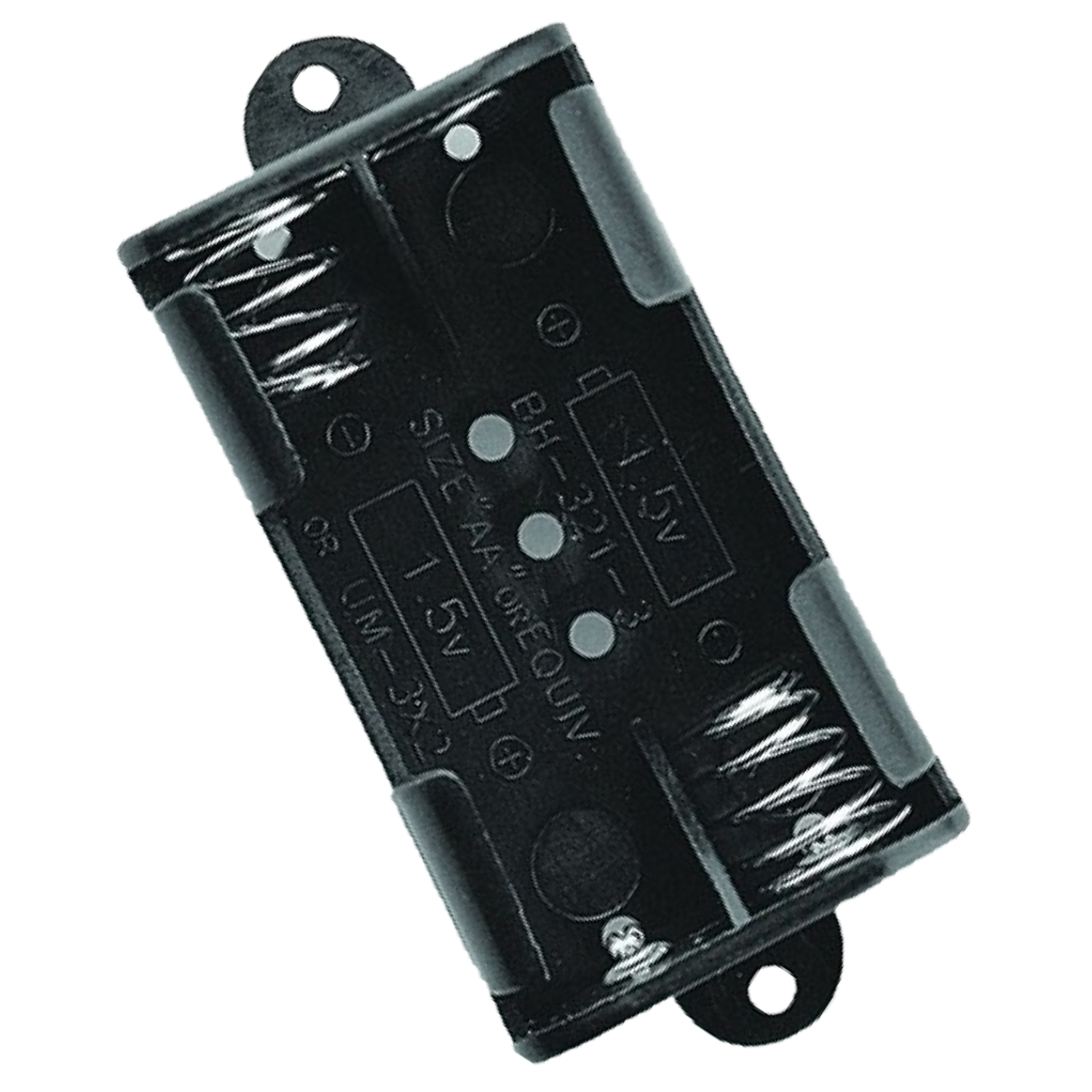 The Philmore BH321M is a reliable battery holder designed for AA Cell batteries and are compatible with UM-3. It is constructed from high-quality plastic materials to ensure long-term durability and secure battery retention. The holder features a versatile and lightweight design, making it ideal for securing to a wall or storing on a hook. The holder consists of a sturdy plastic casing that securely houses two AA Cell batteries in a side-by-side configuration. It includes spring-loaded metal contacts that provide a reliable connection to the batteries, ensuring optimal conductivity. The holder also features clearly marked positive (+) and negative (-) terminals for easy battery installation and polarity identification.