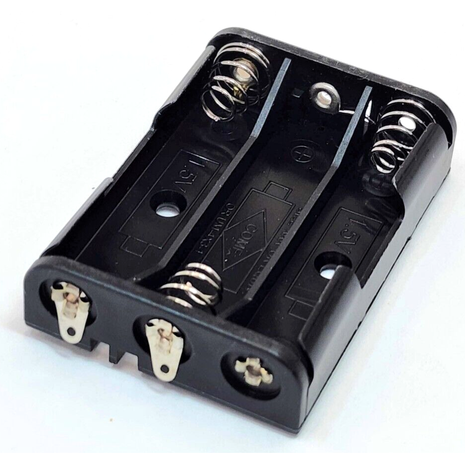 The Philmore BH431 is a reliable battery holder designed for AAA Cell batteries and are compatible with UM-4. It is constructed from high-quality plastic materials to ensure long-term durability and secure battery retention. The holder features a compact and lightweight design, making it ideal for various electronic applications, including flashlights, TV remotes, and other devices requiring AAA Cell battery power. The holder consists of a sturdy plastic casing that securely houses three AAA Cell batteries in a side-by-side configuration. It includes spring-loaded metal contacts that provide a reliable connection to the batteries, ensuring optimal conductivity. The holder also features clearly marked positive (+) and negative (-) terminals for easy battery installation and polarity identification.