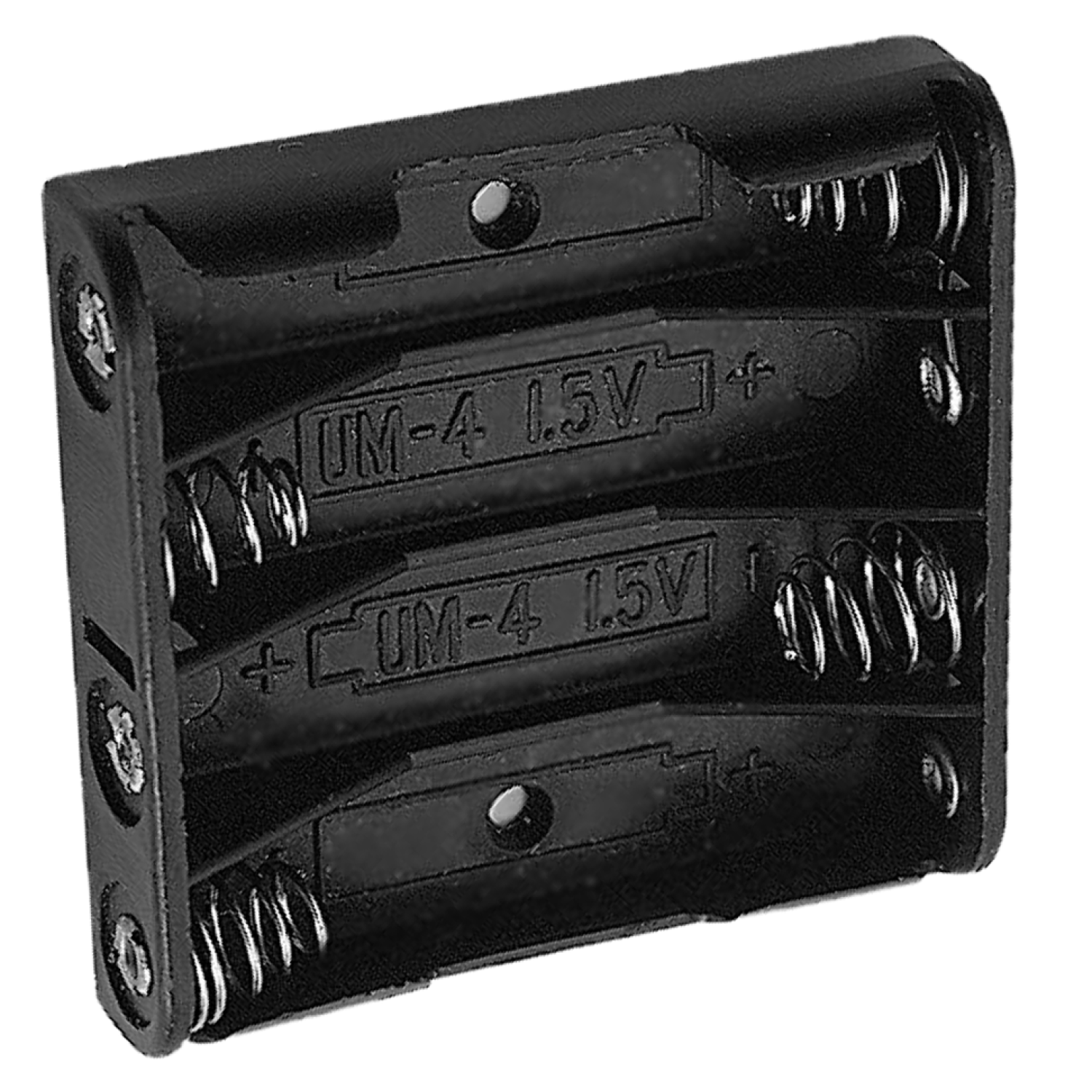 The Philmore BH441P is a reliable battery holder designed for AAA Cell batteries and are compatible with UM-4. It is constructed from high-quality plastic materials to ensure long-term durability and secure battery retention. The holder features a compact and lightweight design, making it ideal for various electronic applications, including flashlights, TV remotes, and other devices requiring AAA Cell battery power. The holder consists of a sturdy plastic casing that securely houses four AAA Cell batteries in a side-by-side configuration. It includes spring-loaded metal contacts that provide a reliable connection to the batteries, ensuring optimal conductivity. The holder also features clearly marked positive (+) and negative (-) terminals for easy battery installation and polarity identification.