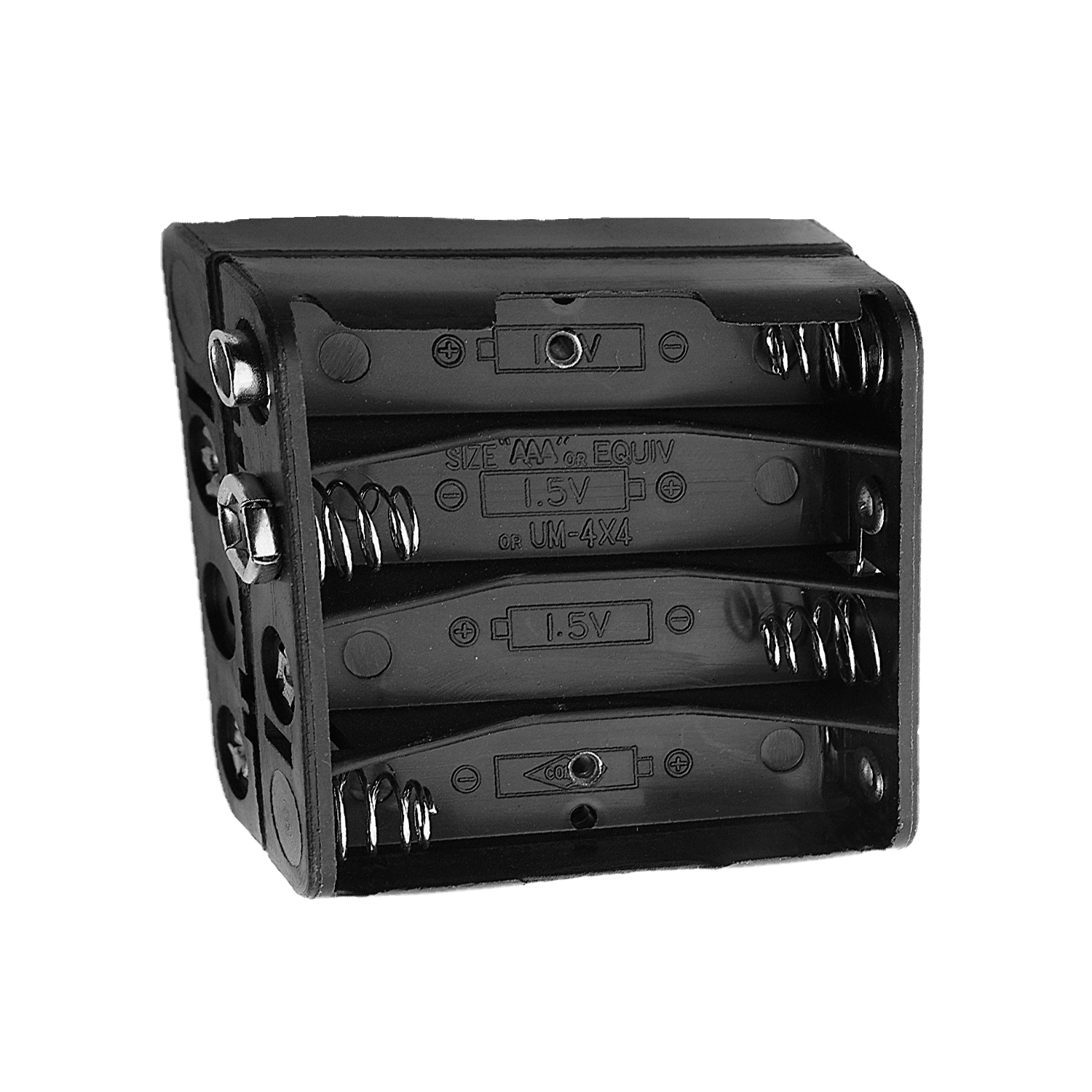 The Philmore BH483 is a reliable battery holder designed for AAA Cell batteries and are compatible with UM-4. It is constructed from high-quality plastic materials to ensure long-term durability and secure battery retention. The holder features a compact and lightweight design, making it ideal for various electronic applications, including flashlights, TV remotes, and other devices requiring AAA Cell battery power. The holder consists of a sturdy plastic casing that securely houses eight AAA Cell batteries in a side-by-side configuration, four on the top and four on the bottom. It includes spring-loaded metal contacts that provide a reliable connection to the batteries, ensuring optimal conductivity. The holder also features clearly marked positive (+) and negative (-) terminals for easy battery installation and polarity identification.