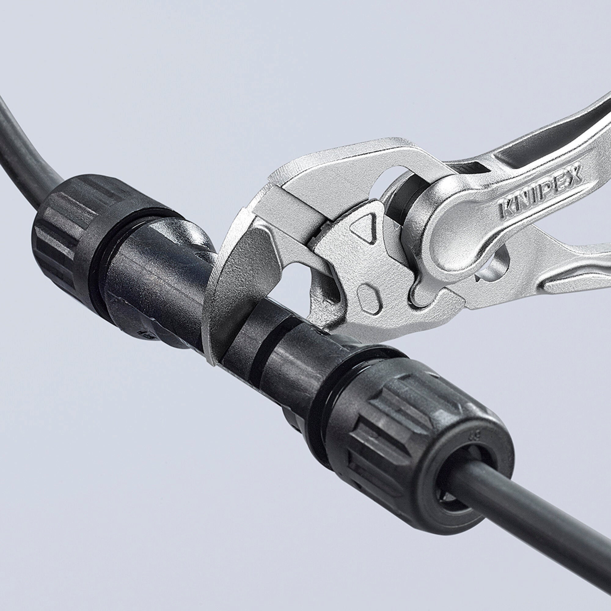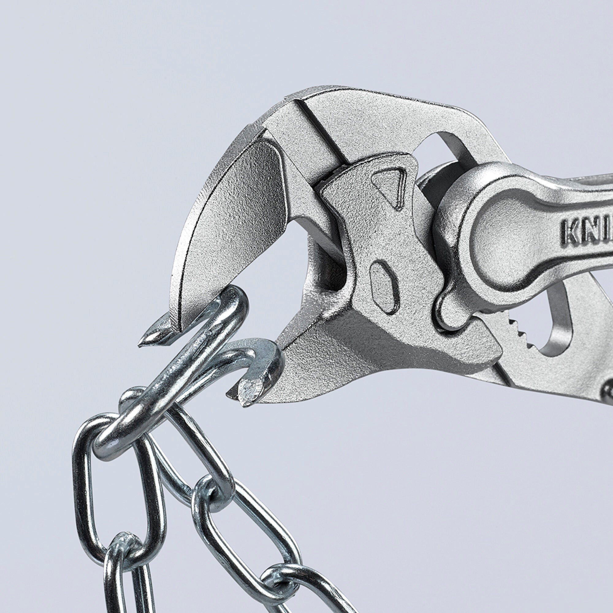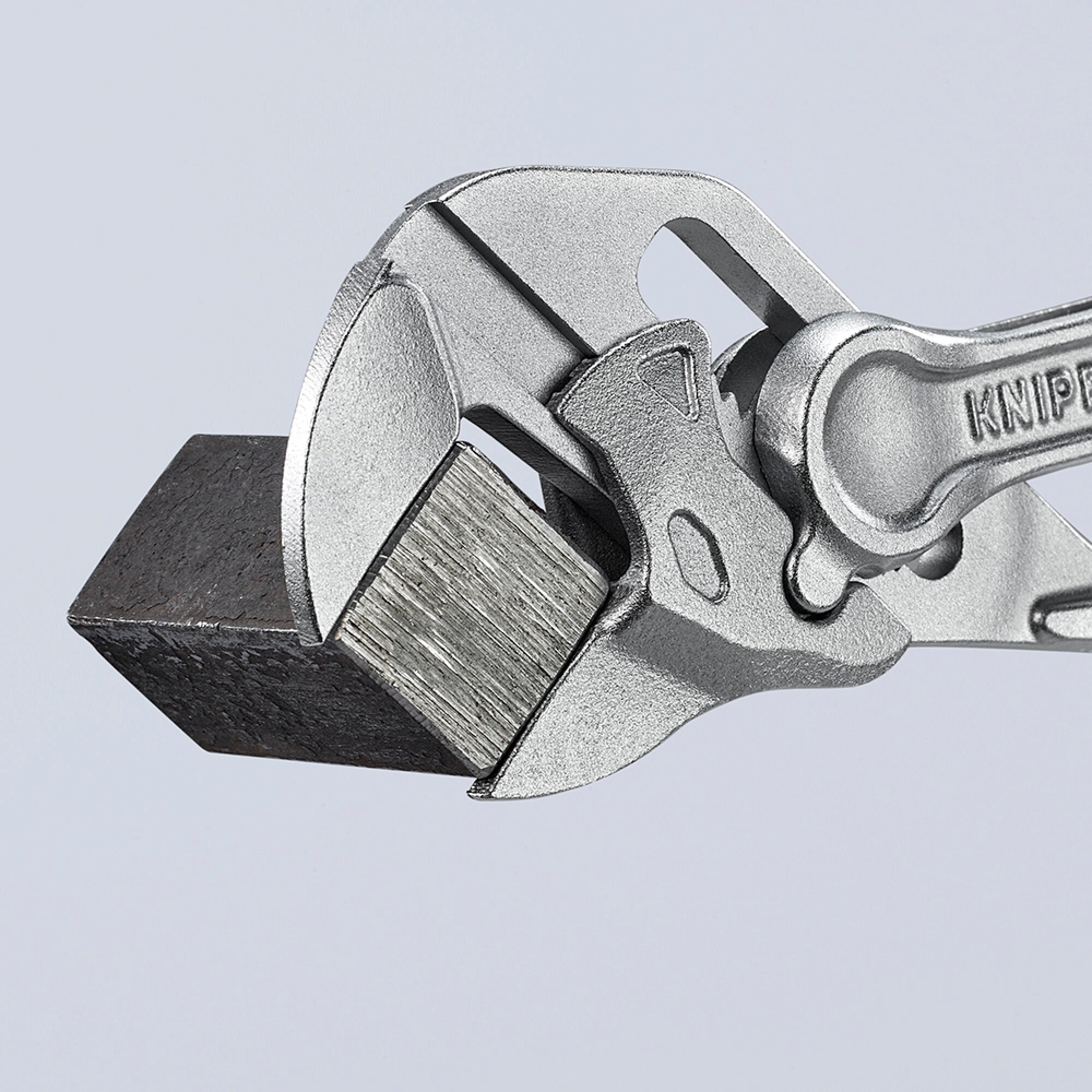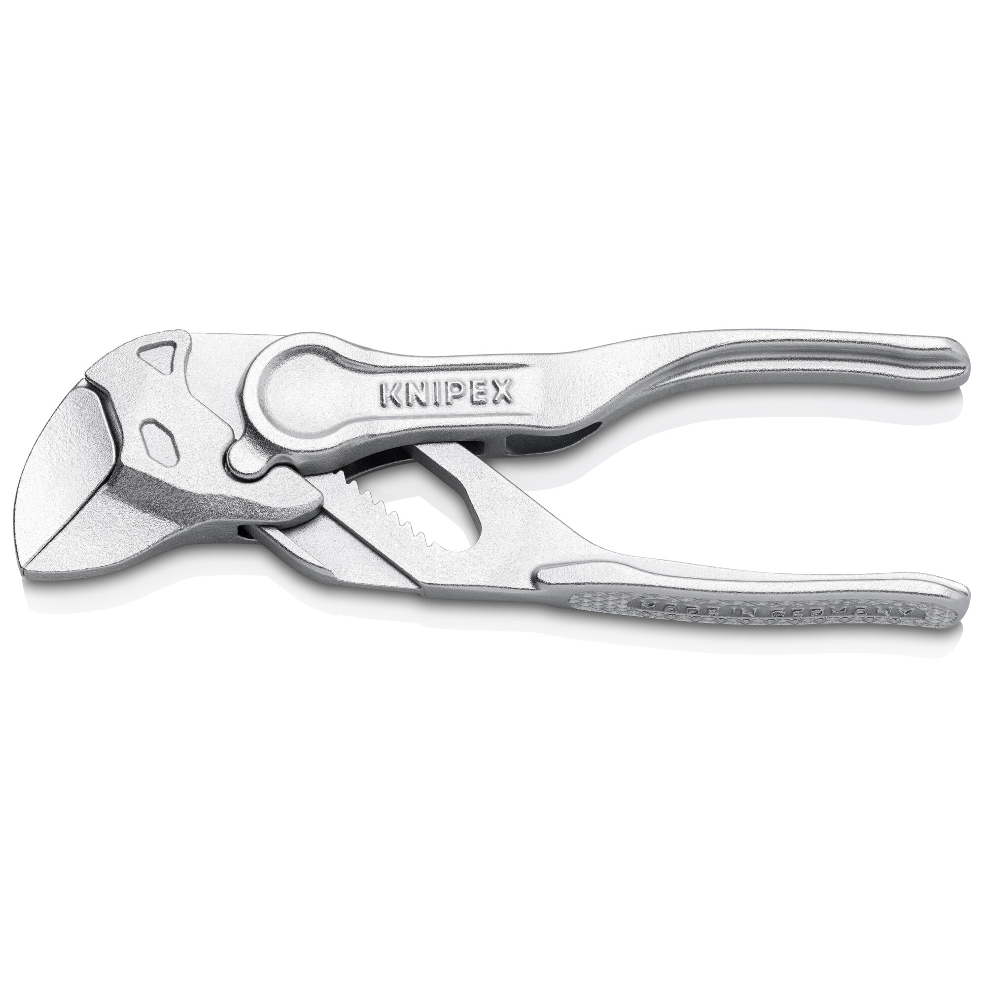 At only 4" this is the smallest fully functioning pliers wrench in the world. One-handed quick adjustment up to 3/4" gripping capacity. Excellent for gripping, holding, pressing and bending applications. Parallel jaws evenly distribute force for a secure grip. Smooth jaws will not mar surface finish. Box-joint design: high stability because of double guide. Texturized handles for a better grip. Pinch guard prevents operators' fingers being pinched. 10 adjustment positions.