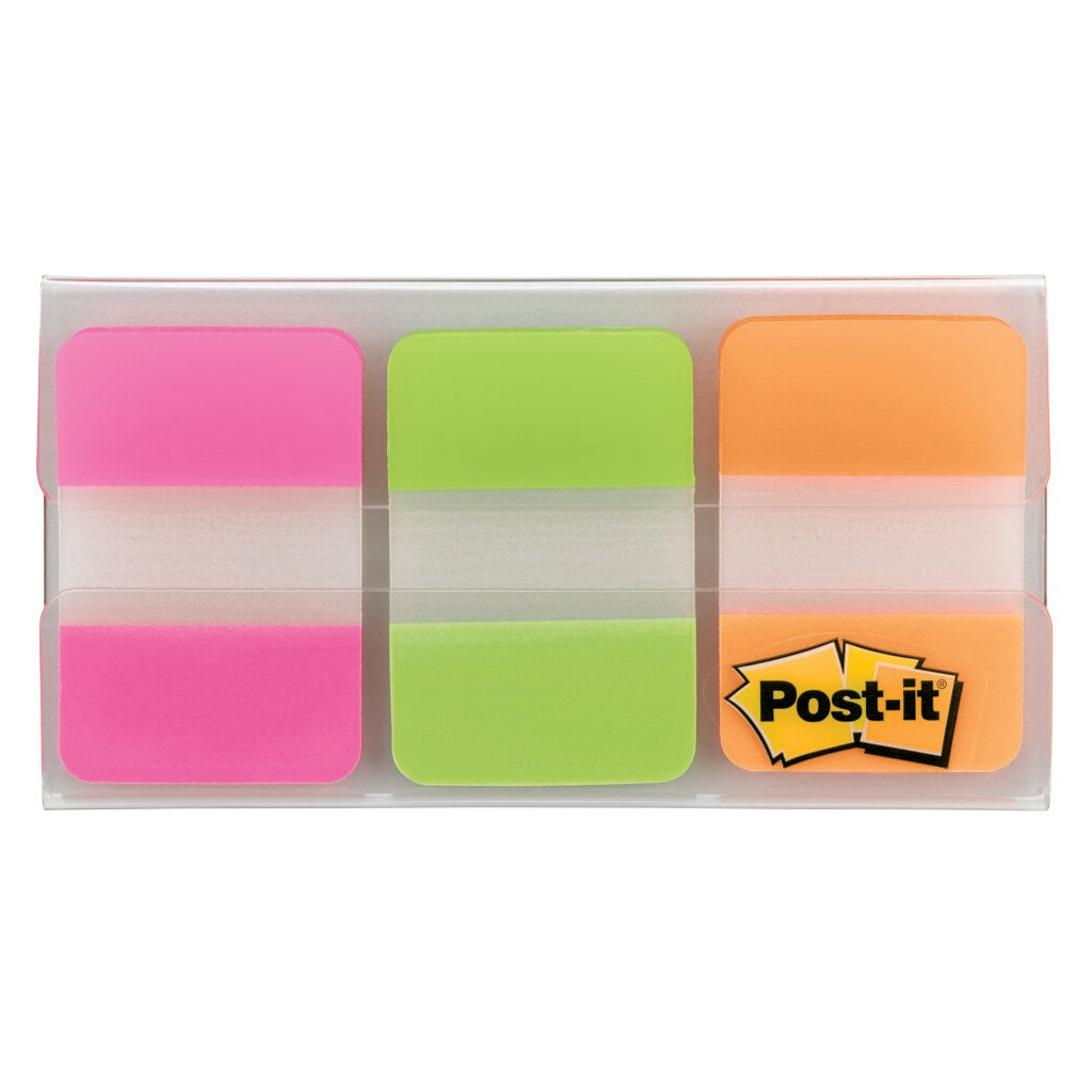 Post-it Tabs are extra thick and strong to stand up to long-term wear and tear. Great for dividing notes, expanding files and project files. 3 colors, 36 tabs total.Post-it Tabs in 1 inch size create necessary order by easily organizing planners and calendars into sections. Solid color bars give you flexibility to organize by color. Tabs are durable, you can write on them, and reposition as needed. They are also great for planners, binders and file folders. Tabs stick securely and remove cleanly. Pink, Green and Orange. Contains 12 tabs/color and 36 tabs/on the go dispenser.