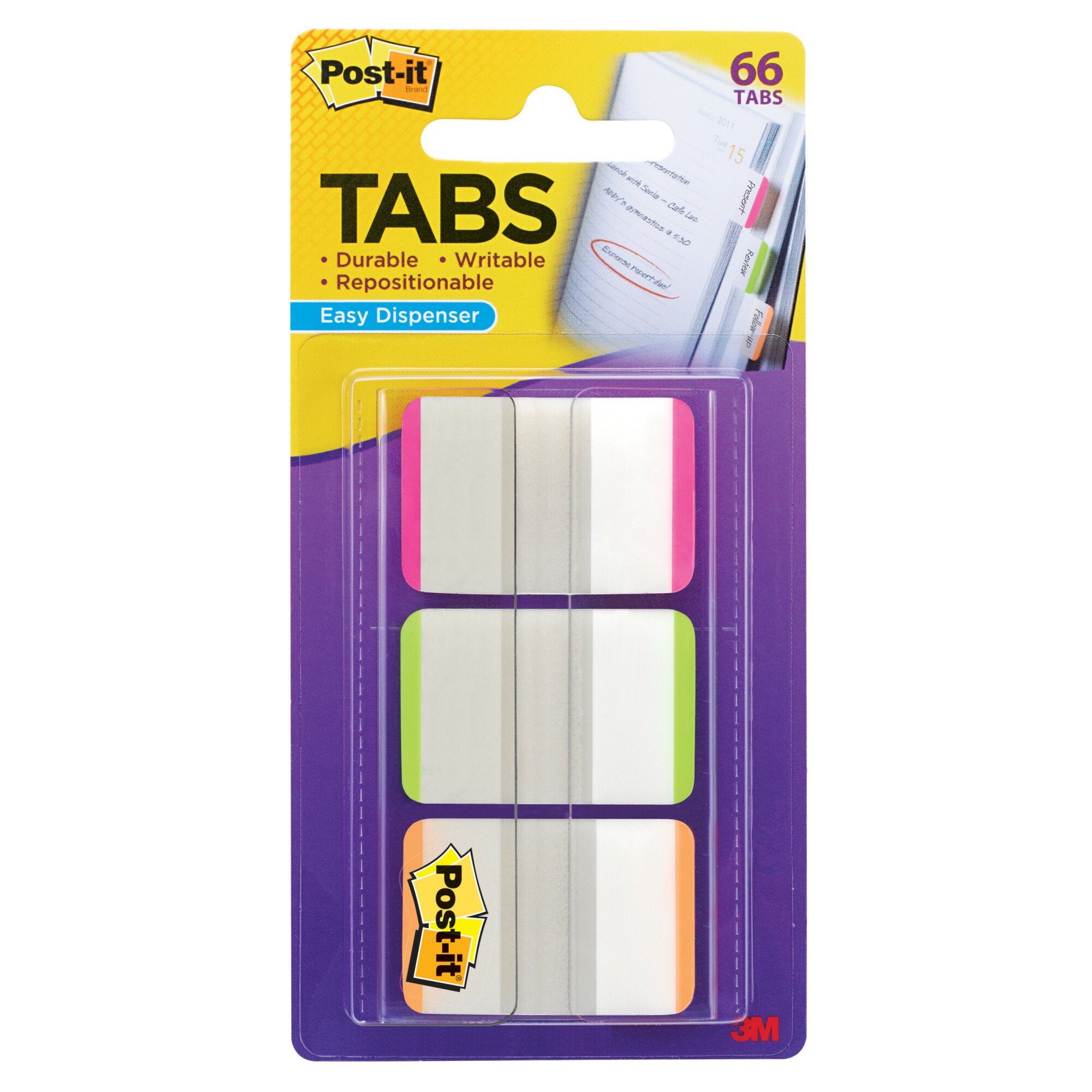 Post-it Durable Filing Tabs make it easy to quickly organize files, notes, and binders! Perfect for expandable files, project folders and notebooks. Easy to write on and simple to remove and reposition.Post-it® Tabs in 1 inch size create necessary order by easily organizing planners and calendars into sections. Lined color bars give you flexibility to organize by color. Tabs are durable, you can write on them, and reposition as needed. They are also great for files, binders and notebooks. Tabs stick securely and remove cleanly. They are also great for binders, planners and notebooks. Pink, Green and Orange. Contains 22 tabs/color and 66 tabs/on the go dispenser.