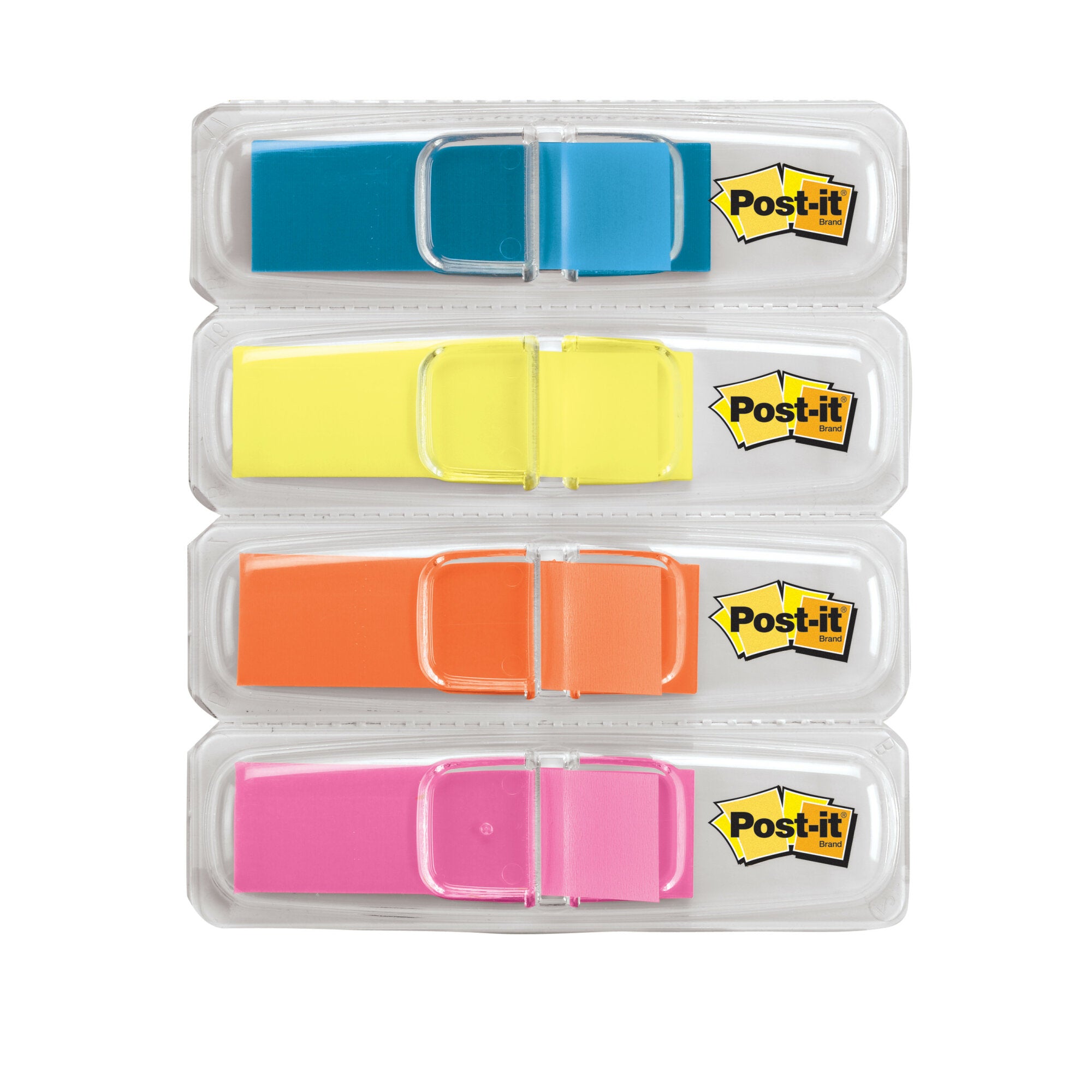Find it fast with Post-it Flags. They make it simple to mark, flag or highlight important information. They stick securely, remove cleanly and come in a wide variety of colors. Draw attention to critical items or use them to index, file or color-code your work, either at home, work or in the classroom.Post-it® Highlighting Flags in assorted Bright colors and .47 in. wide size saves you from missing an important detail or item. Strong adhesive makes flags stay put and lets you reposition them as well. The dispenser makes one handed dispensing easy to help keep you on track. Contains 35/dispenser and 4 dispensers/pack.
