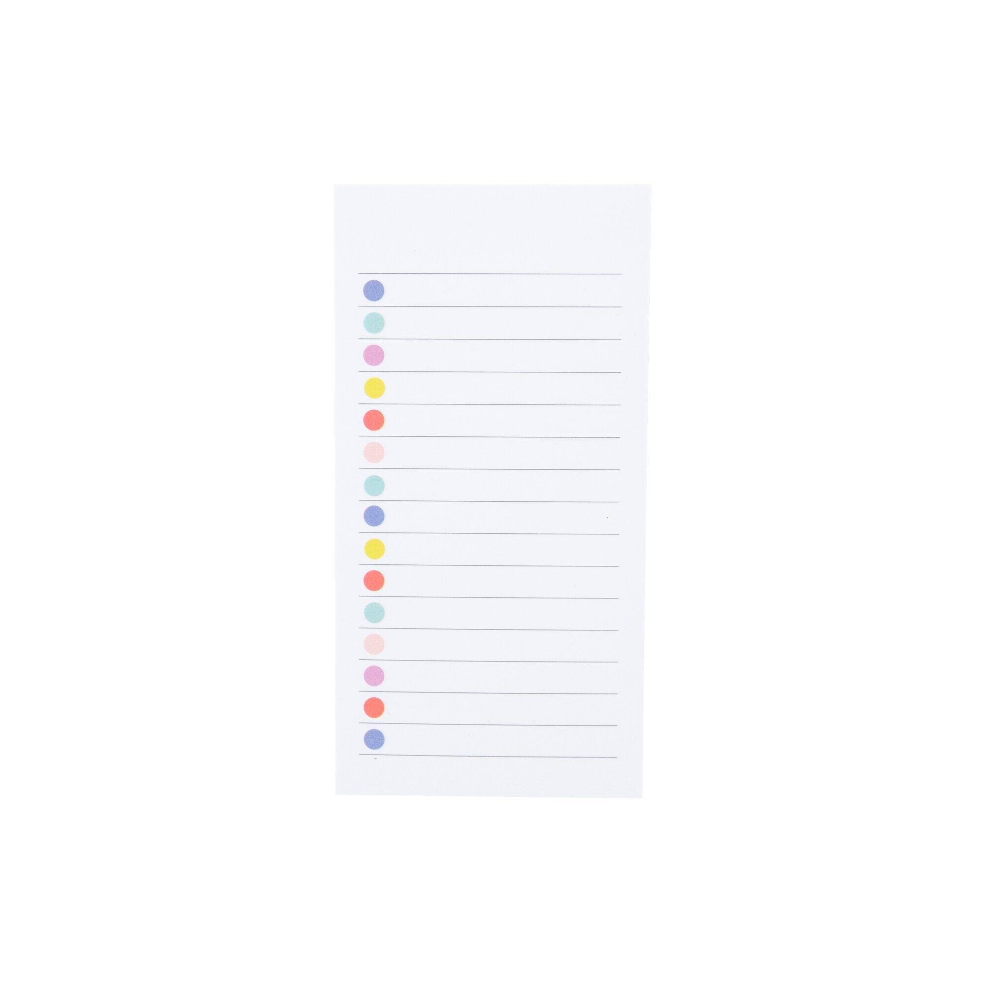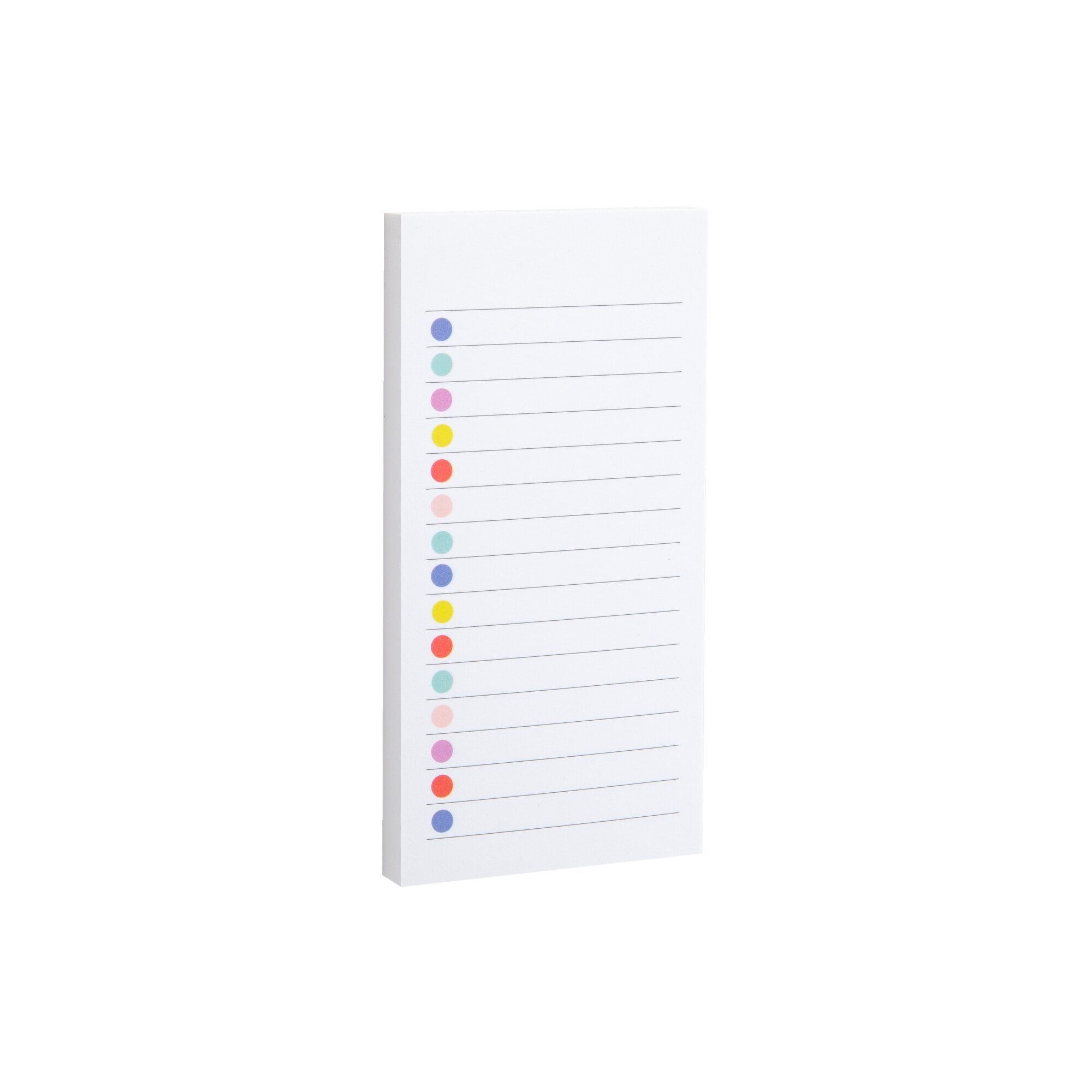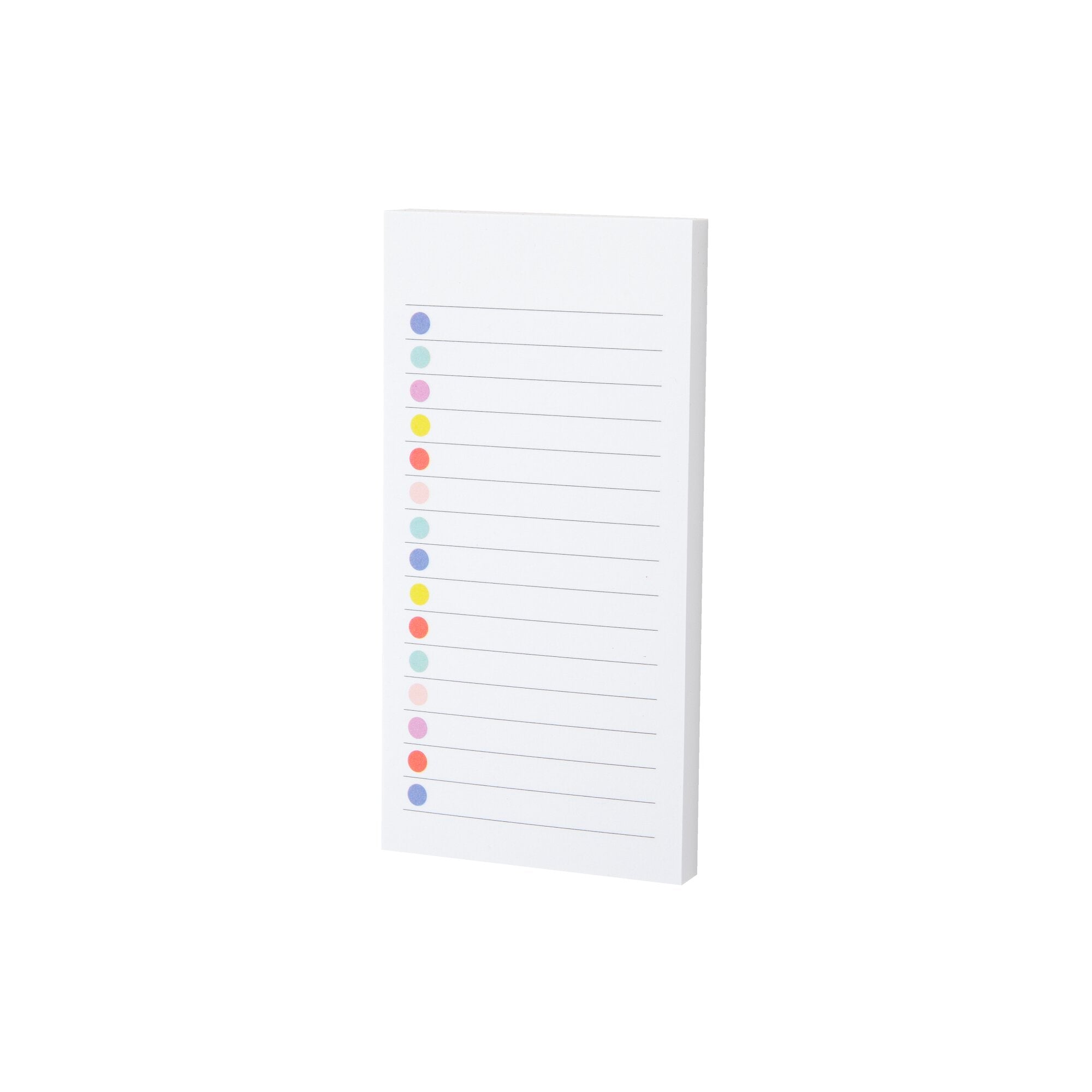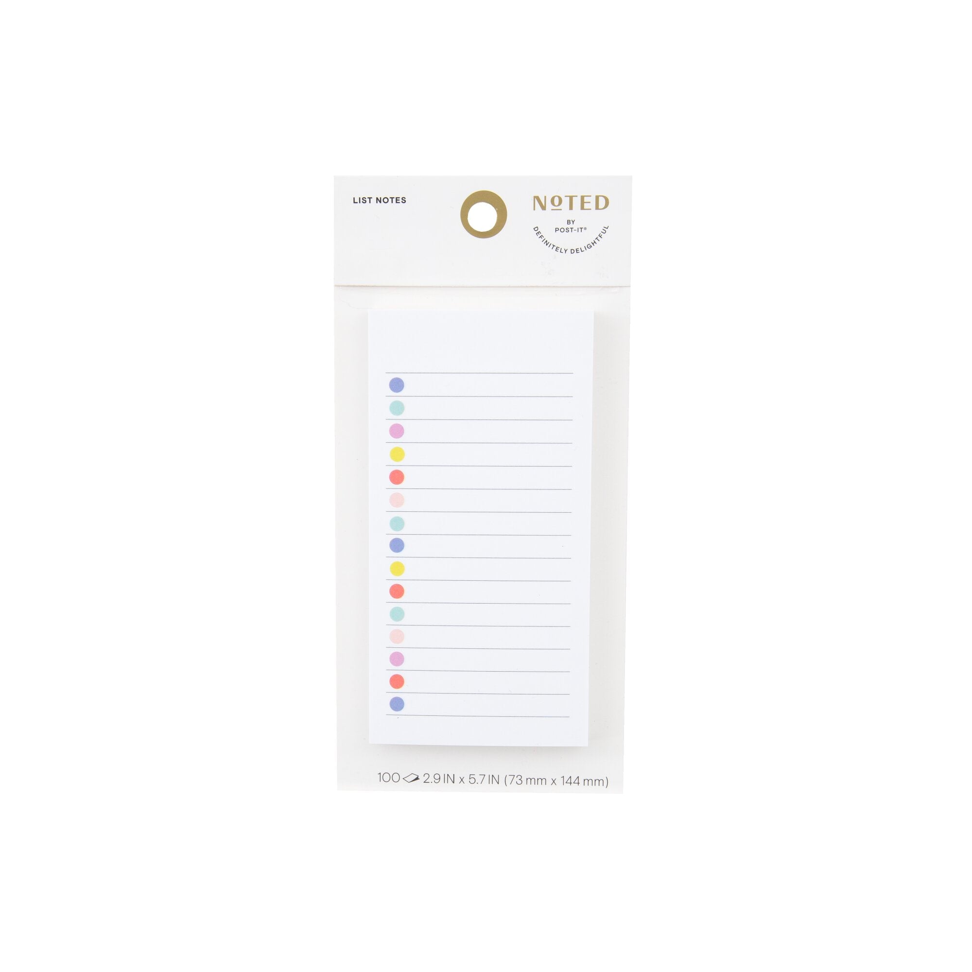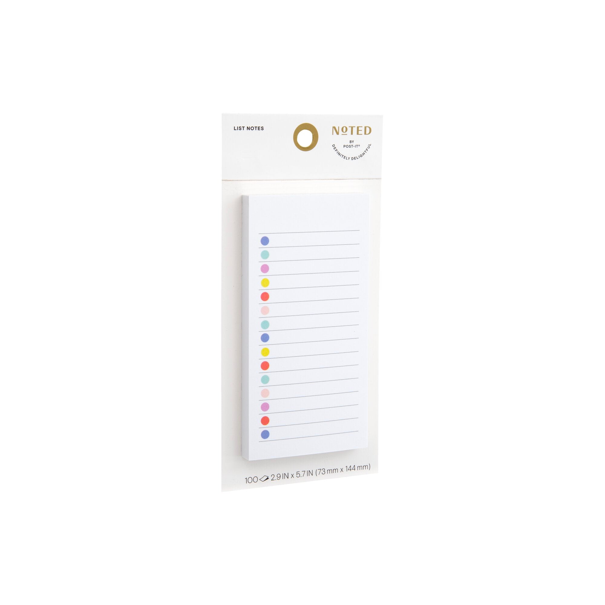 Noted by Post-it Brand NTD8-38-1, 2.9 in x 7.7 in Long List Notes 100 sheetMeet Noted by Post-it®, a collection of delightfully designed desktop accessories to help inspire, wrangle and commemorate life’s most notable moments. The 2.9 in. x 5.7 in. small white lined pad with colored dots on each line give you a fun way to check off or color code your to-dos. Featuring a unique adhesive designed to work on paper, these notes are great for use in planners or on calendars. 1 Pad/Pack, 100 Sheets/Pad. Post-it® Notes are recyclable.