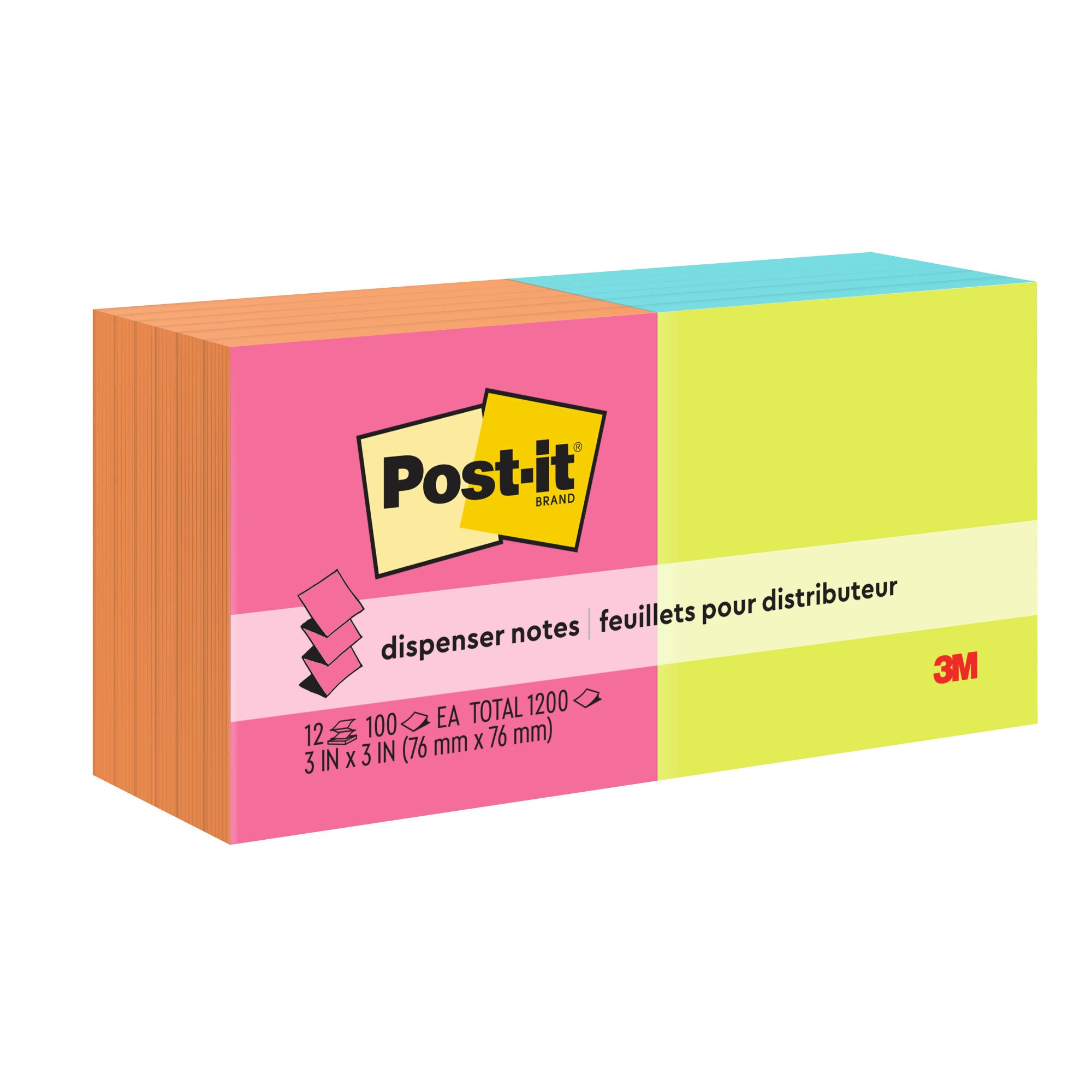 For use with Pop-up Dispensers, these unique fan-fold, accordion-style Pop-up notes pop up for one note, one hand convenience at your fingertips.Post-it® Dispenser Notes, 3 in. x 3 in., are accordion-style notes specially designed to work in Post-it® Note Dispensers. With these notes, you'll always have a note nearby to capture great ideas. Unique adhesive is designed to work on paper or in planners. Use for notes or reminders to yourself or others. Pads are in two alternating from the Poptimistic Collection - 6 pads alternate between Power Pink and Vital Orange, while the other 6 pads alternate with Acid Lime and Aqua Splash. Post-it® Dispenser Notes are recyclable and the paper in Post-it® Notes is sourced from certified, renewable and responsibly managed forests. 12 Pads/Pack, 100 Sheets/Pad.
