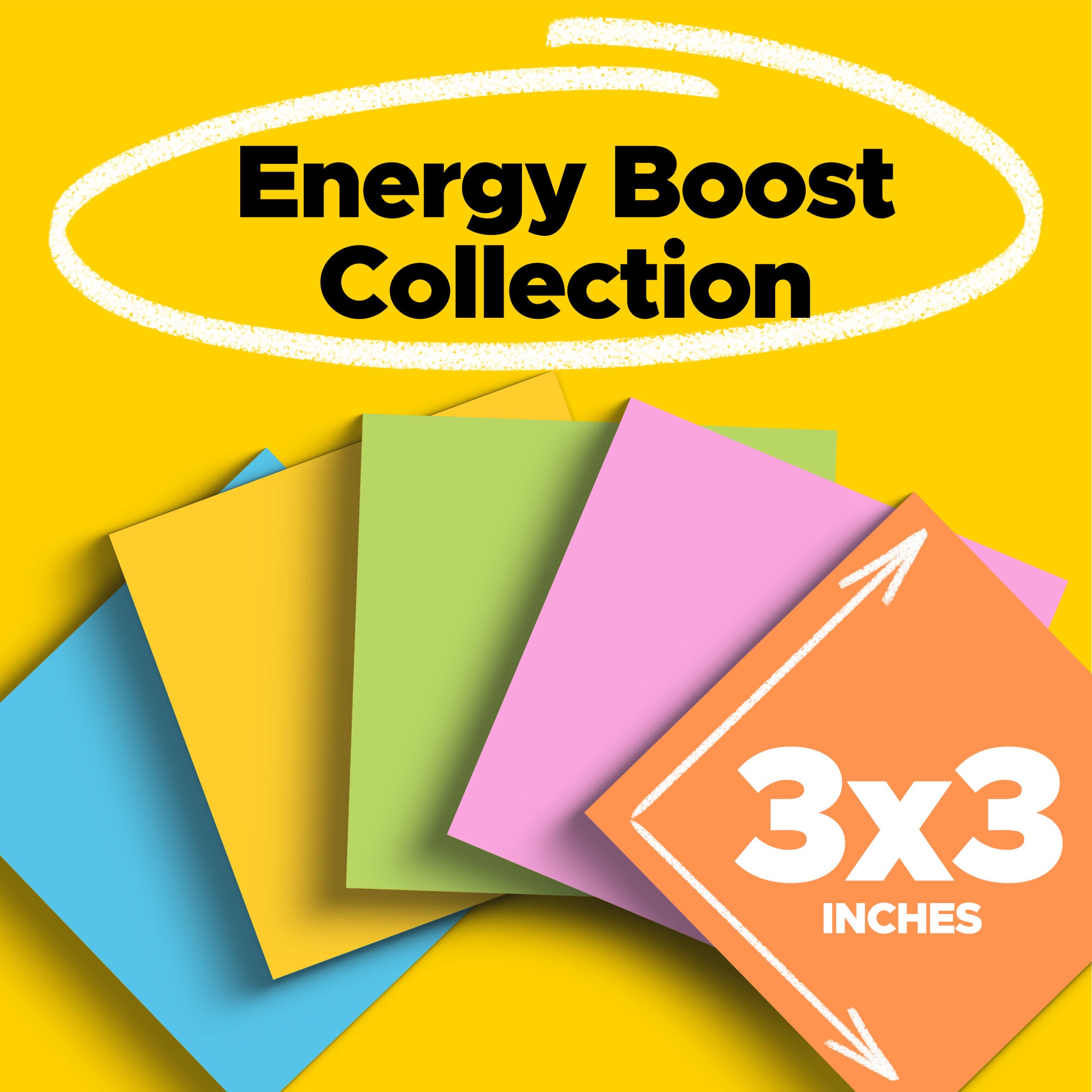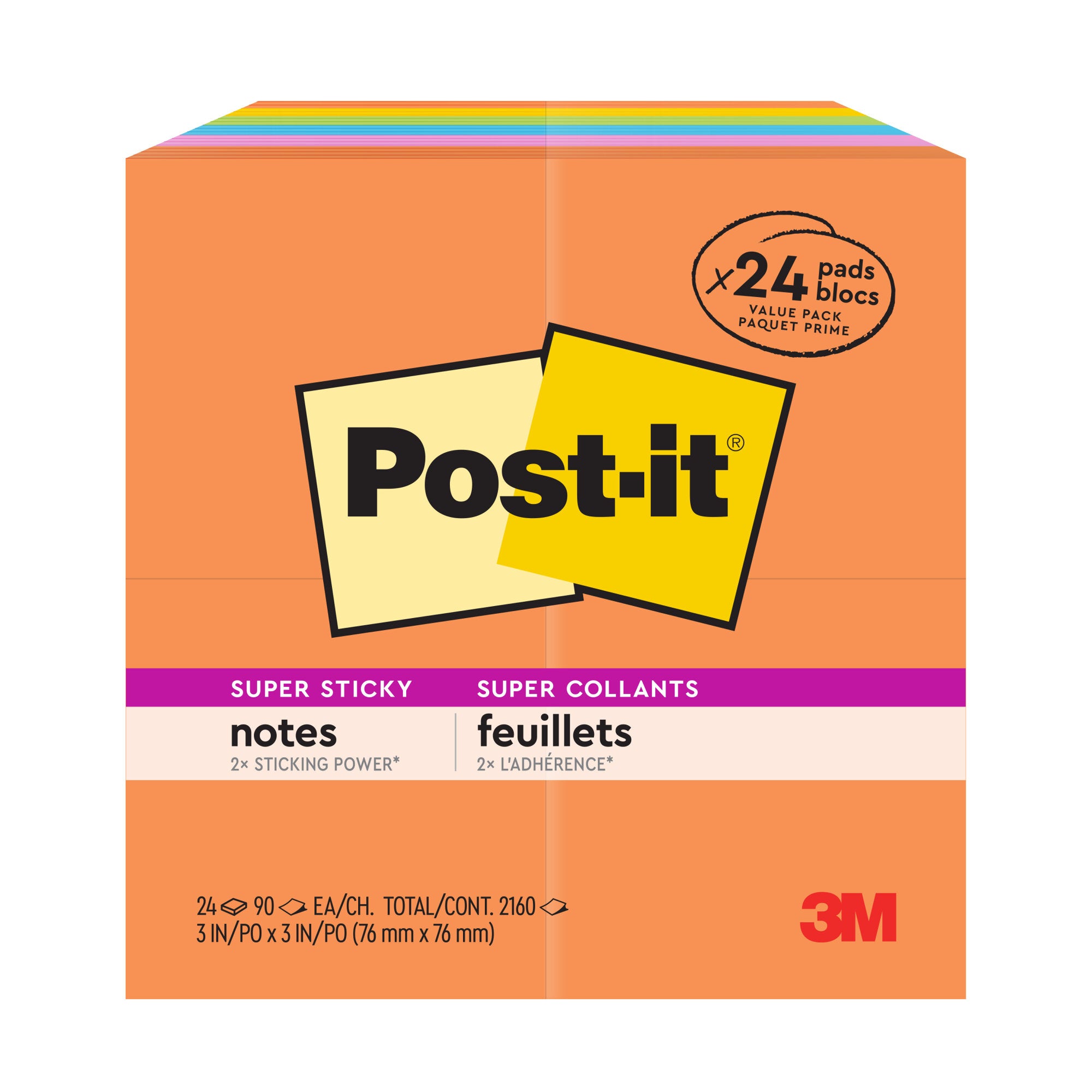 Post-it Super Sticky Notes feature 2X the sticking power. With these notes you can stick and re-stick to move reminders and to-dos with you throughout the day.Uplift your spirits and messages via the vibrant, strong colors of the Energy Boost collection. Whether jotting down your daily to-do's, brainstorming big ideas, studying or setting reminders, colors and ideas are always brighter together. These sticky notes feature 2X the sticking power. They also stick and re-stick - allowing you to move your notes with you throughout your day. They’re ideal for walls, doors, windows and other vertical surfaces, and like all Post-it Notes, they stick securely yet remove cleanly without damage. Keep your ideas across your notebooks, classroom books, calendars or other documents. No tape or tacks are needed with adhesive notes, saving you money and time on office products or school supplies. A great memo pad, these are ideal for using for notes or reminders to yourself or others. Post-it Super Sticky Notes are the perfect solution for shopping lists, reminders, notes on computer screens, time tracking, to-do lists, marking cables, color-coding documents, reminding kids to do chores, storyboarding, scratch paper and agile processing. Each notes sheet is approximately 3 in. x 3 in., with 90 sheets per pad and 24 sticky note pads per pack. These colorful sticky notes include colors from the Energy Boost collection including orange, pink, yellow, blue and green. All Post-it Notes are sourced from certified, renewable and responsibly managed forests, and all Post-it Notes are recyclable, so you can recycle them when they are no longer needed.