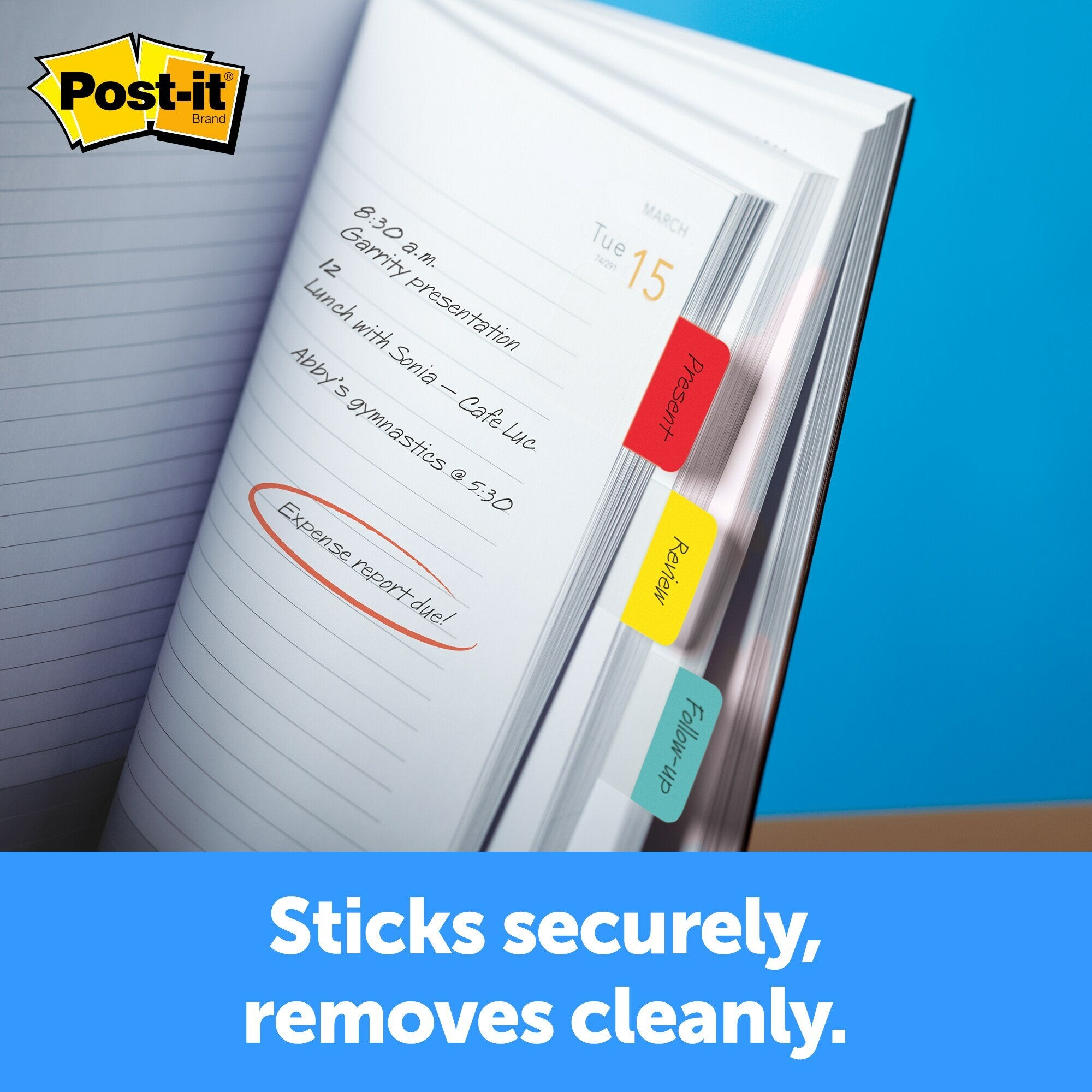 Post-it Tabs make it easy to quickly organize binders, notebooks, planners and more! Easy to write on and simple to remove and reposition. Contains 22 each of aqua, lime, yellow and red tabs in 1 in. size with a convenient dispenser.Post-it Tabs in 1 inch size create necessary order by easily organizing planners and calendars into sections. Solid color bars give you flexibility to organize by color. Tabs are durable, you can write on them, and reposition as needed. They are also great for planners, binders and file folders. Tabs stick securely and remove cleanly. Aqua, Lime, Yellow and Red. Contains 22 tabs/color and 88 tabs/on the go dispenser.