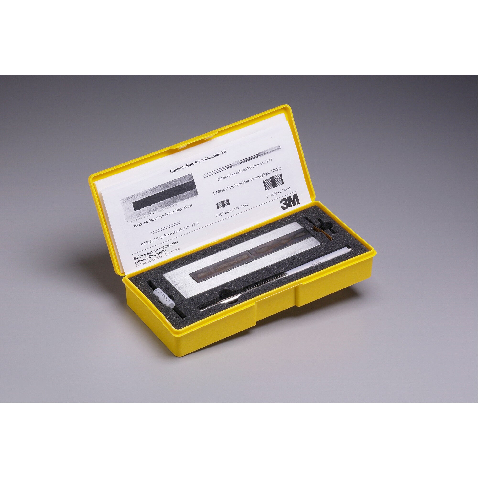 The 3M Roto Peen Assembly Kit contains the components needed for captive shot peening, repair or maintenance of metal parts. Each kit includes a Roto Peen Almen Strip Holder, TC-330 Roto Peen Flap Assemblies in two sizes (9/16 x 1-1/4 and 1 x 2), and Roto Peen Mandrels 7210 and 7211. This kit does not include the Almen Strips, Die Grinder, Almen Gauges, or other measurement equipment.