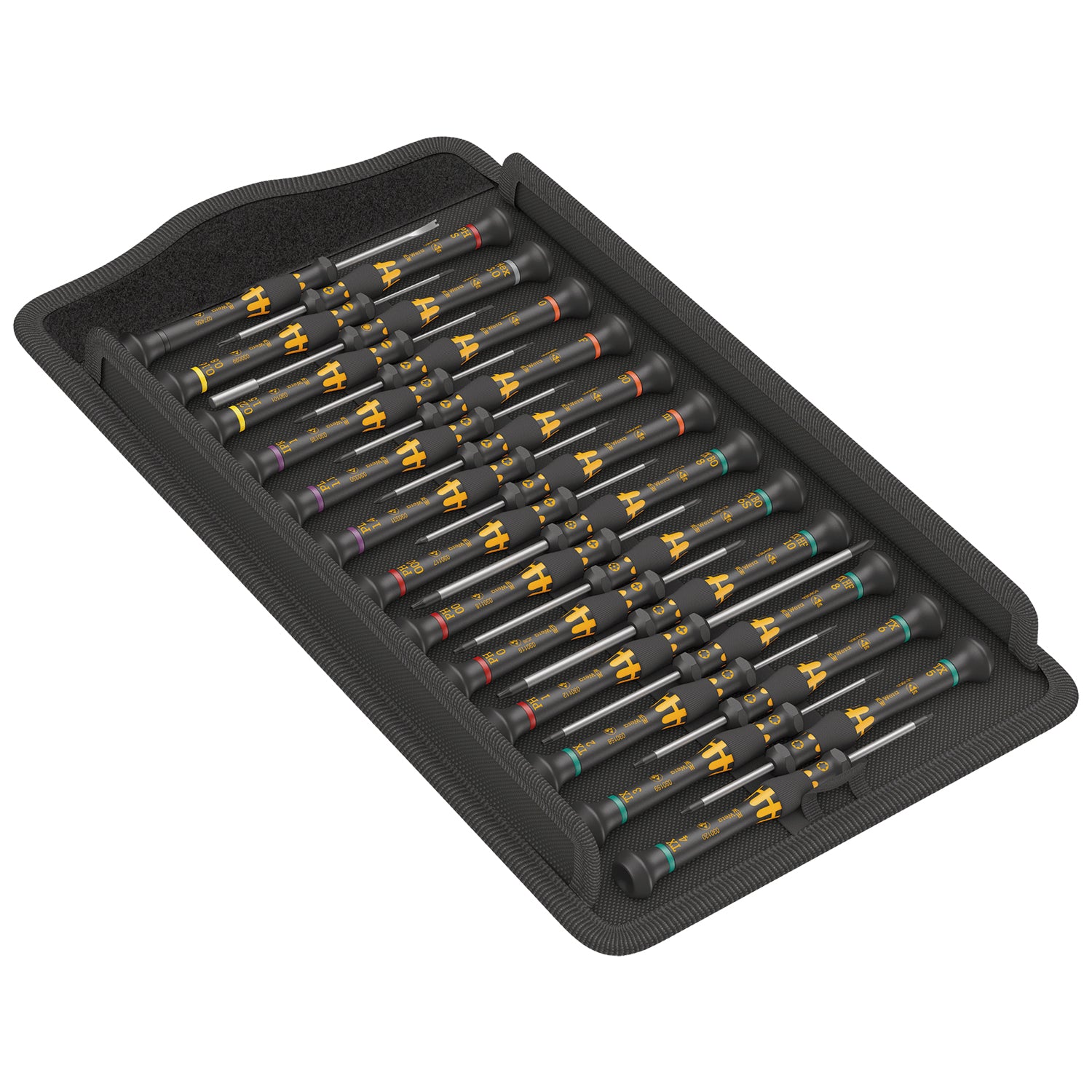 Electrostatically secured Wera Micro screwdriver 25-piece set. The included screw profiles are especially suitable for the use on mobile phones and tablets. Safe protection against electrostatic energy and associated damage. By supporting the hand on the rotating cap, and by the fast rotating zone below the rotating cap, lightning fast turning is possible. Time-consuming hand switching is eliminated. The power zone with integrated soft zones ensures the transmission of high tightening and loosening moments. Precision zone for correct rotation angles whilst adjusting. The Black Point tip provides fitting accuracy and optimum corrosion protection. Take it easy tool finder with size stamping and colour coding by profile to find the required tool quickly and easily. Storage and transport in a robust textile pouch, so the tool is well protected and always close at hand.