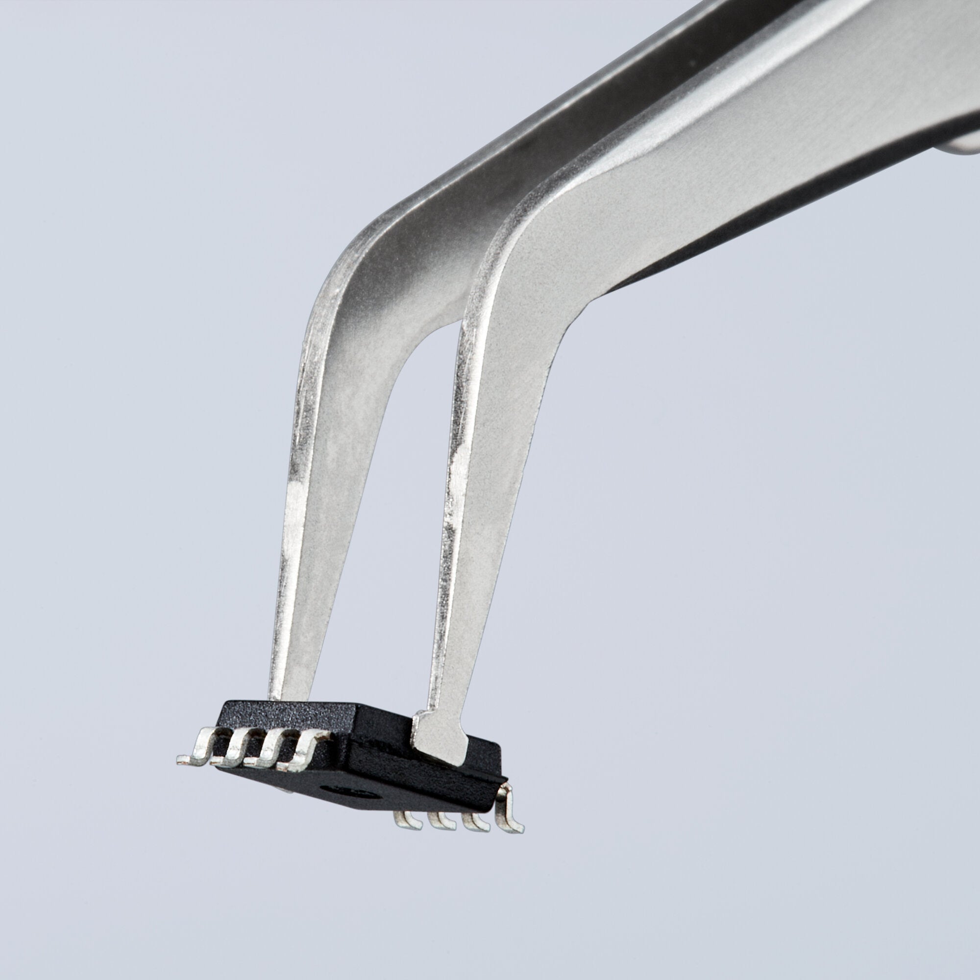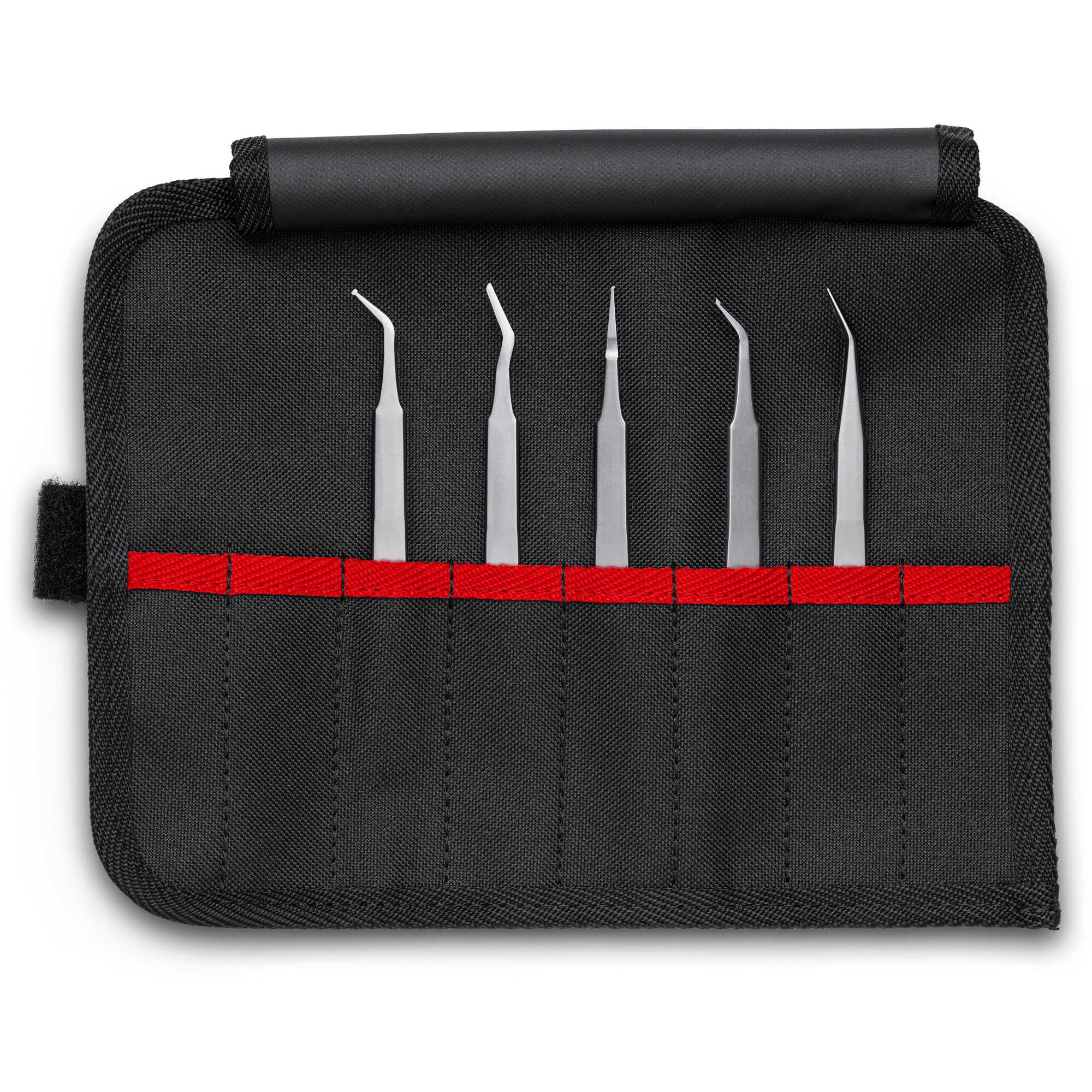The KNIPEX SMD Stainless Steel Tweezers Set is a specialized tool set designed specifically for surface mount device (SMD) work. Constructed from high-quality stainless steel, these tweezers offer precise handling and manipulation of delicate SMD components, ensuring accurate placement and soldering onto the circuit board. With various tip shapes included, this set provides versatility and reliability with SMDs in assembly work, laboratory processes, clean room environments, circuit board repairs and reworking in the electronics industry. Excellent resistance to a wide range of chemicals, salts, and acids. The 80% anti-magnetic feature offers protection, precise handling, versatility, and durability. Smooth gripping surface ensures a secure and gentle grip on objects without causing damage or leaving unwanted marks.. Smooth handles allow for prolonged and precise use. Set includes the following in a tool roll: 92 02 54 (30°), 92 01 02 (35° double angle), 92 01 01 and 92 01 04 (45°) and 92 01 03 (Straight tips) - Premium Stainless Steel Positioning Tweezers-SMD. Seven compartment tool roll made of hard-wearing polyester fabric.