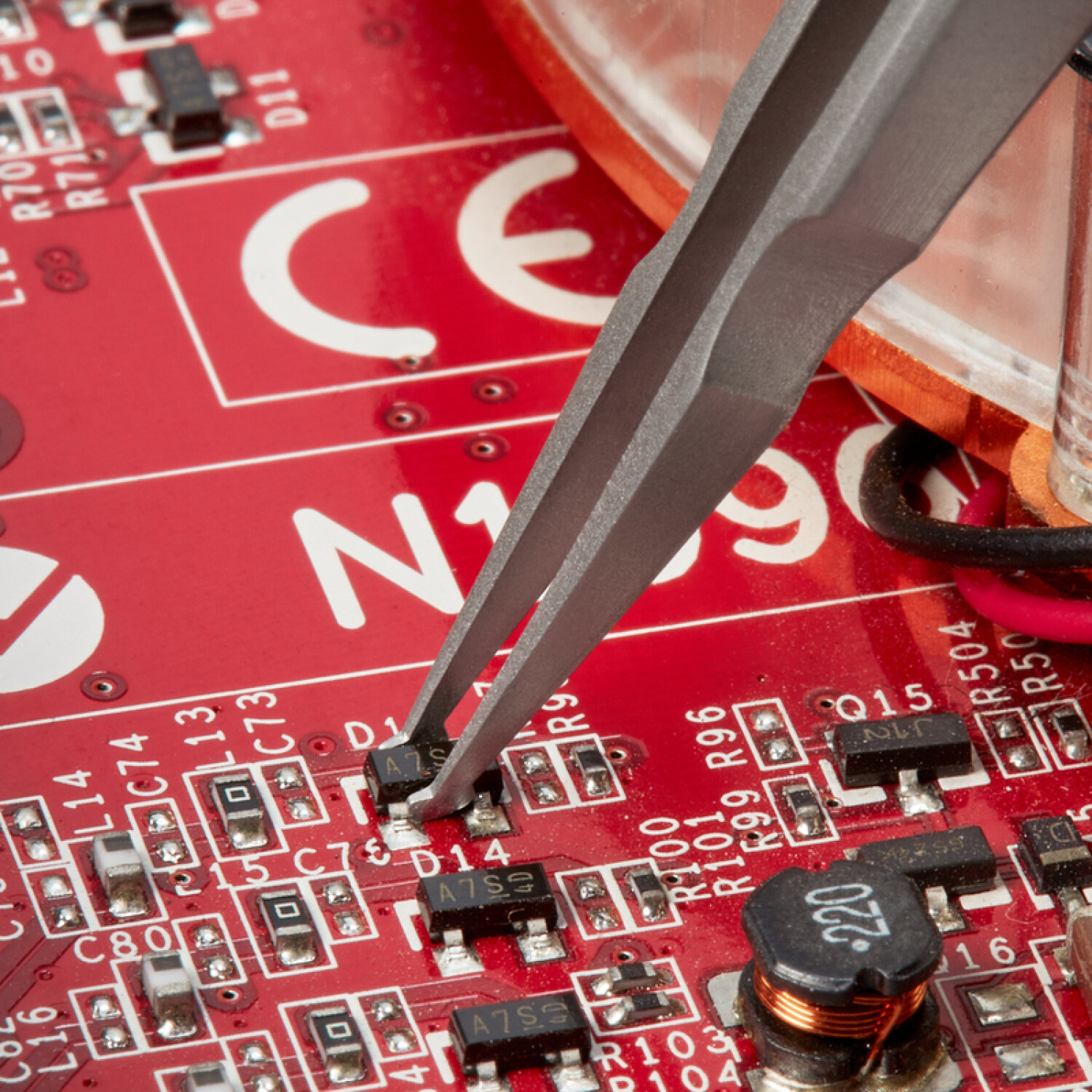 Premium Stainless Steel Positioning Tweezers-SMD Premium stainless steel resists most chemicals, salts and acids. Straight tips provide excellent precision and control when picking up and handling small objects. Positioning tips offer exact positioning of components when working on surface mounted devices (SMD). Smooth gripping surface will not mar fine components. Smooth handles minimizes any potential interference with surrounding materials. 80% anti-magnetic design minimizes magnetic interference. High temperature and excellent chemical resistance. SMD (surface mounted device) tweezers position electronic components to be soldered directly onto the circuit board.