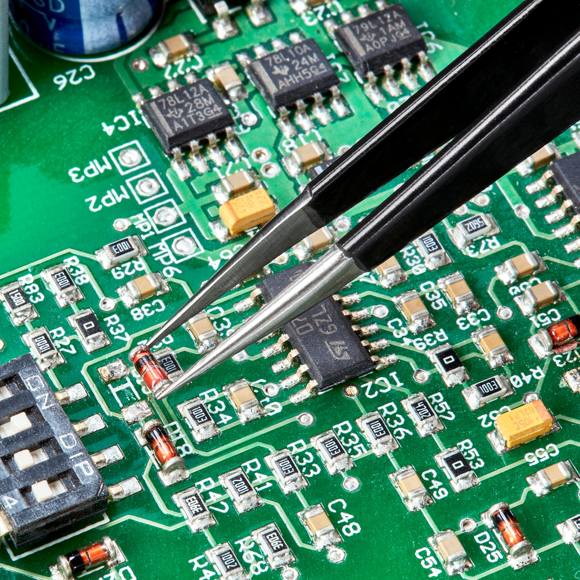 • Needle-point tips offer extra-fine gripping on very small components and wire